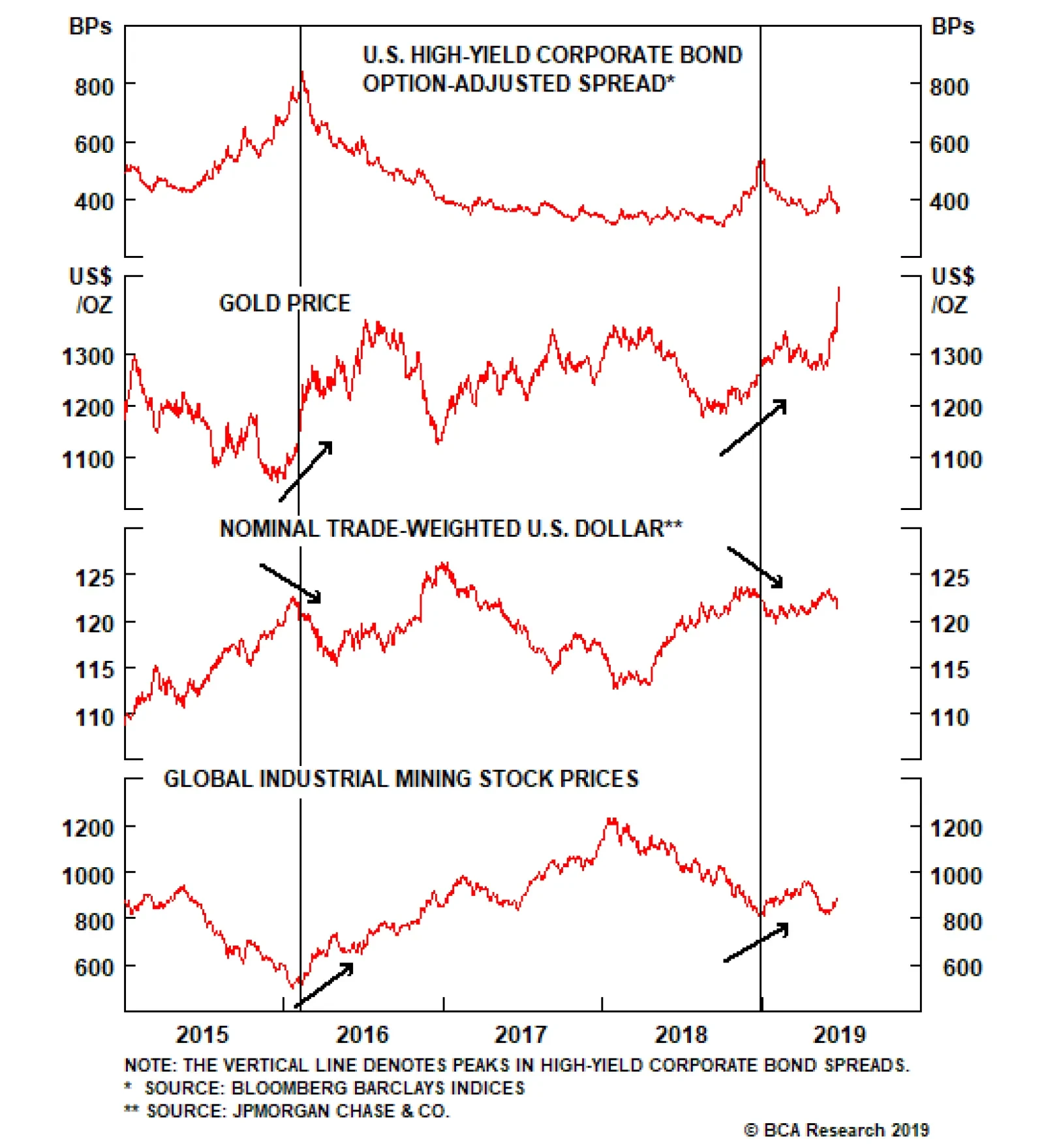 Investment grade corporate bonds outperformed the duration-equivalent Treasury index by 144 basis points in June, bringing year-to-date excess returns up to +368 bps. We removed our recommendation to hedge near-term corporate credit exposure after the Fed’s clear dovish pivot at the June FOMC meeting.1 At that time, we also noted that the surging gold price, weakening trade-weighted dollar and outperformance of global industrial mining stocks were all signaling that corporate spreads have peaked (Chart 2). Of our “peak credit spread” indicators, only the CRB Raw Industrials index has yet to turn the corner. The macro environment supports tighter spreads. But in the investment grade space, value only looks attractive for Baa-rated securities. Baa spreads remain 7 bps above our target (panel 3), while Aa and A-rated spreads are 1 bp and 4 bps below, respectively (panel 4). Aaa bonds are even more expensive, with spreads 19 bps below target (not shown).2 Investors should focus their investment grade corporate bond exposure on Baa-rated securities. Our measure of gross leverage – total debt over pre-tax profits – jumped in Q1, as corporate debt grew at an annualized pace of 8.5% while corporate profits contracted by an annualized 18% (bottom panel). Leverage will likely rise again in Q2, as profit growth will almost certainly remain weak, but should then level-off as global growth recovers.