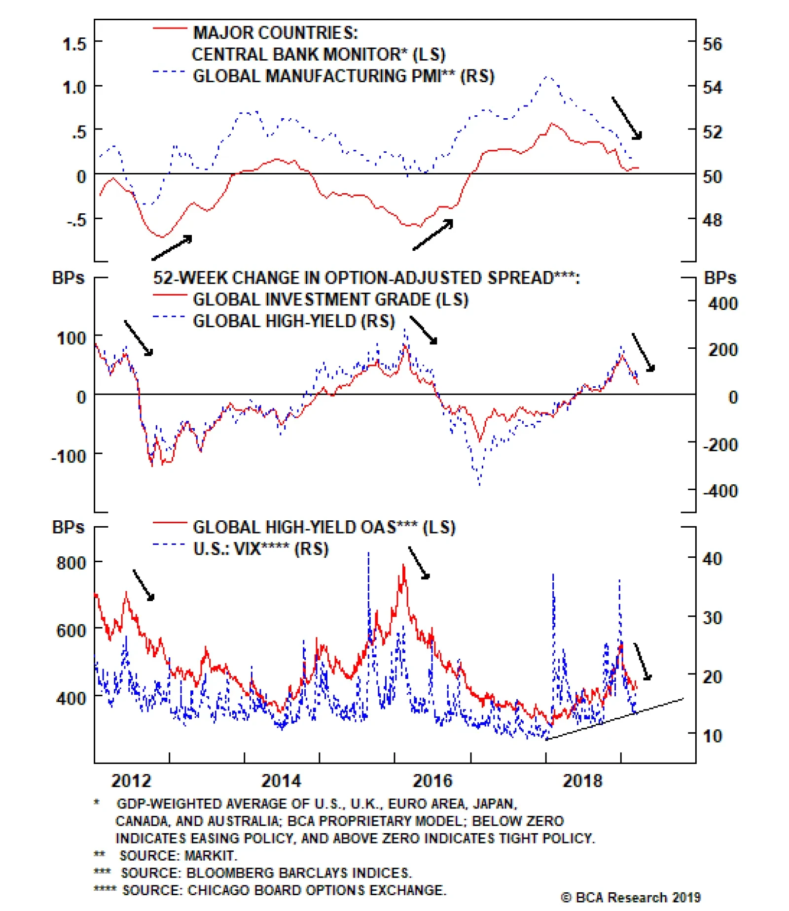 Highlights U.S. growth remains robust, despite some temporary softness in recent months. Ex U.S., growth continues to fall but, with China probably now ramping up monetary stimulus, should bottom in the second half. Central banks everywhere have turned more dovish, partly in an attempt to push up inflation expectations. The combination of resilient growth and easier monetary policy should be good for global equities. We remain overweight equities versus bonds. Bond yields have fallen sharply everywhere. However, with U.S. inflation still trending up, and central banks unlikely to turn any more dovish this year, yields are unlikely to fall much further in 2019. We recommend a slight underweight on duration. We remain overweight U.S. equities, but are on watch to upgrade the euro zone and Emerging Markets when we have stronger conviction about China’s stimulus. Given structural headwinds in both Europe and EM, this would probably be only a tactical upgrade. We have been tilting our equity sector recommendations in a more cyclical direction, last month raising Industrials and Energy to overweight. We also prefer credit over government bonds within the fixed-income category, though we warn that spreads will not fall much further given weak corporate fundamentals. Feature Recommended Allocation