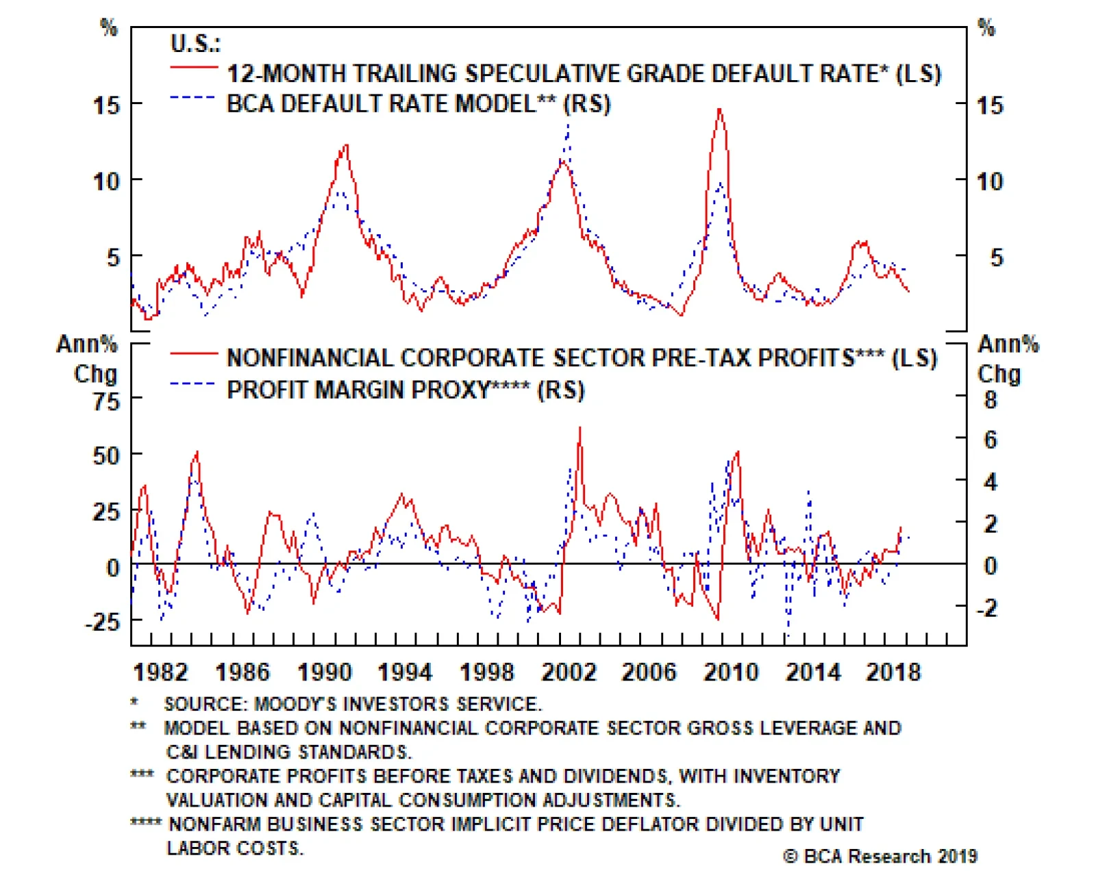 Highlights Corporate Default Rate: The trailing 12-month corporate default rate is too low according to our macro model. Further, the likely trajectories for corporate profit and debt growth suggest that the default rate is more likely to rise than fall during the next 12 months. We expect the corporate default rate to be above 3% during the next 12 months, higher than the Moody’s baseline forecast of 1.7%. Corporate Bond Valuation: Corporate bond investors are still adequately compensated for default risk, even under our more pessimistic scenario. However, some junk spread widening later this year is possible if market default rate expectations converge with our more pessimistic forecast. Investment Strategy: Corporate spreads have room to tighten in the near-term, due to accommodative Fed policy and a budding improvement in global growth. However, tighter Fed policy and a higher-than-expected corporate default rate could pressure spreads wider in the second half of 2019. We will be quick to back off our overweight corporate bond stance when our near-term spread targets are met. Feature Investors should remain overweight corporate bonds within U.S. fixed income portfolios, but be conscious that the window for outperformance may close quickly. While the Fed’s dovish turn and signs of global growth stabilization will allow spreads to tighten during the next few months, corporate default risk is rising in the background. This week’s report focuses on corporate default risk. We assess where the default rate is headed during the next 12 months and discuss the implications for investment strategy. Default Rate Near A Bottom Chart 1 shows that the trailing 12-month speculative grade default rate has been steadily falling since early 2017. However, it also shows that the fair value reading from our macro-driven default rate model has not fallen as much. The actual trailing 12-month default rate came in at 2.7% in February, the fair value reading from our model stands at a loftier 3.6%. Chart 1Corporate Default Rate Near A Bottom?