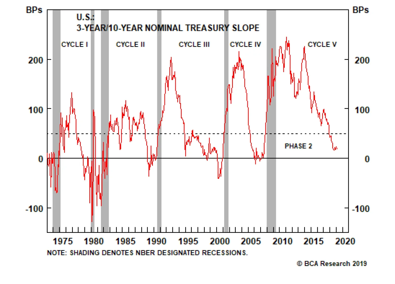 At BCA, we define the three phases of the cycle as follows: Phase 1: From the end of the prior recession until the 3-year / 10-year Treasury slope flattens to below 50 bps; Phase 2: When the 3/10 slope is between 0 bps and 50 bps; Phase 3: From when…