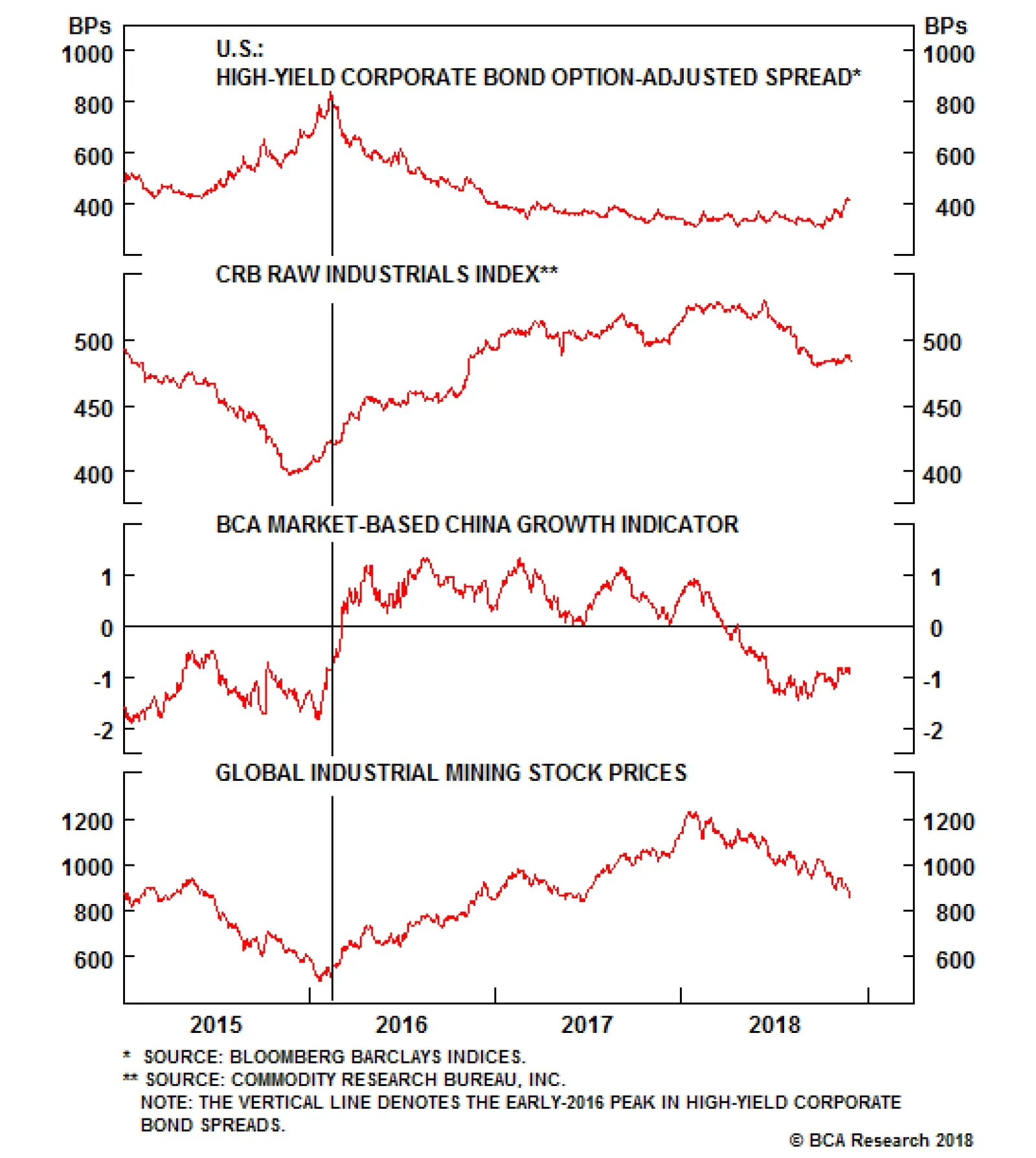 All three indicators are highly sensitive to global demand, and they signaled the peak in credit spreads in early 2016. Most importantly, they are updated daily and can therefore be tracked in real time. The first indicator is the CRB Raw Industrials…