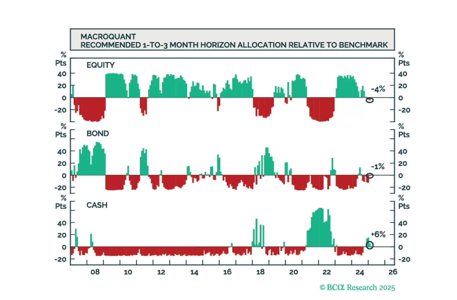 The MacroQuant model is no longer bullish on stocks but is not yet prepared to turn underweight. Subjectively, the Global Investment Strategy team is more bearish on equities than the model.