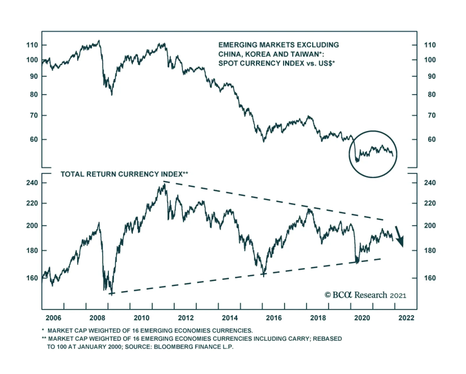 The mainstream EM (EM economies excluding China, Korea and Taiwan) equity market cap-weighted currency spot rate versus the US dollar is not far from its 2020 spring lows. On a total return basis – when carry…