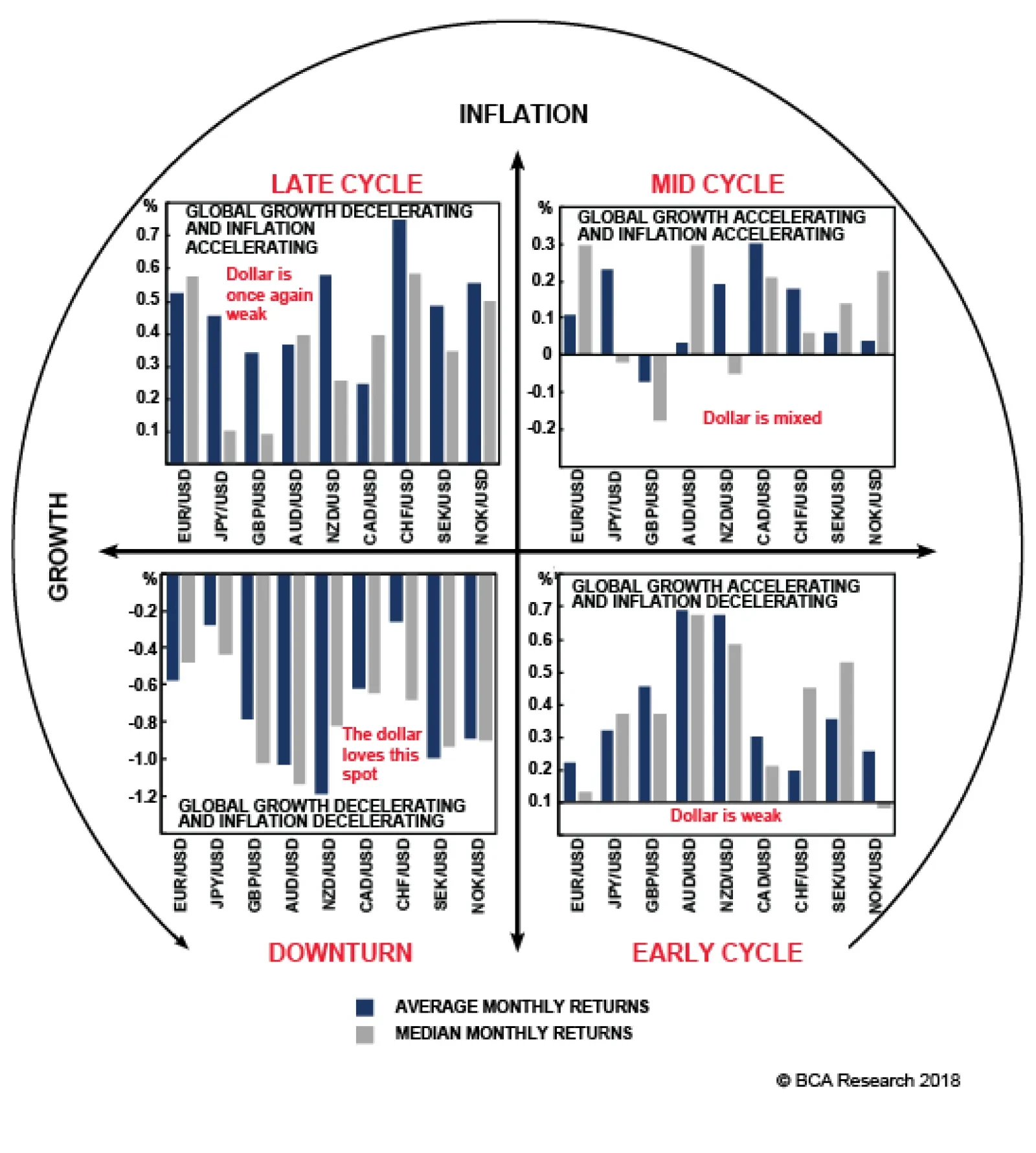 As the chart above shows, the dollar’s behavior is a function of where we stand in the global economic and inflation cycle. Our Foreign Exchange Strategy team looked at the performance of G10 currencies versus the dollar…