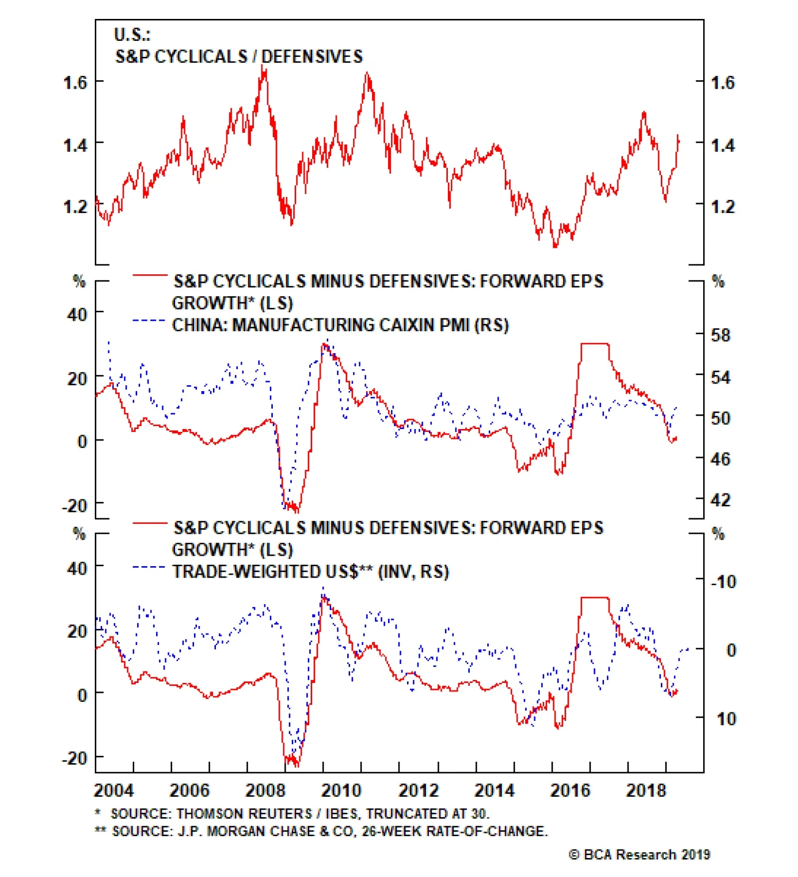 In all three ways we get a value of roughly 3,150 on the SPX, which serves as our end-year 2020 SPX target. In our DDM, we moved the recession to 2021 from 2020 previously, added a year to our 5-year rolling estimates and continue to conservatively assume no buybacks. With regard to the sensitivity analysis, our 2021 EPS estimate is $191, a discount to the $205 currently penciled in by the sell-side, and our base case calls for a 16.5x forward multiple. Finally, the bottom part of Table 2 shows our forward ERP assumptions. We lifted the equilibrium ERP from 200bps to 250bps given the recent setback it suffered and our 10-year Treasury yield also moved down 50bps to 3.5%. Consistent with our sensitivity analysis base case, the starting point is $191 2021 EPS. In all three ways we get a value of roughly 3,150 on the SPX, which serves as our end-year 2020 SPX target. (If you would like to receive our excel spreadsheet in order to adjust our assumptions please email our client requests department here). This week we update our cyclicals/defensives portfolio bent view and a set a stop sell order to an overweight early-cyclical niche subsector. Stick With Cyclicals Over Defensives, For Now Chart 3China…
