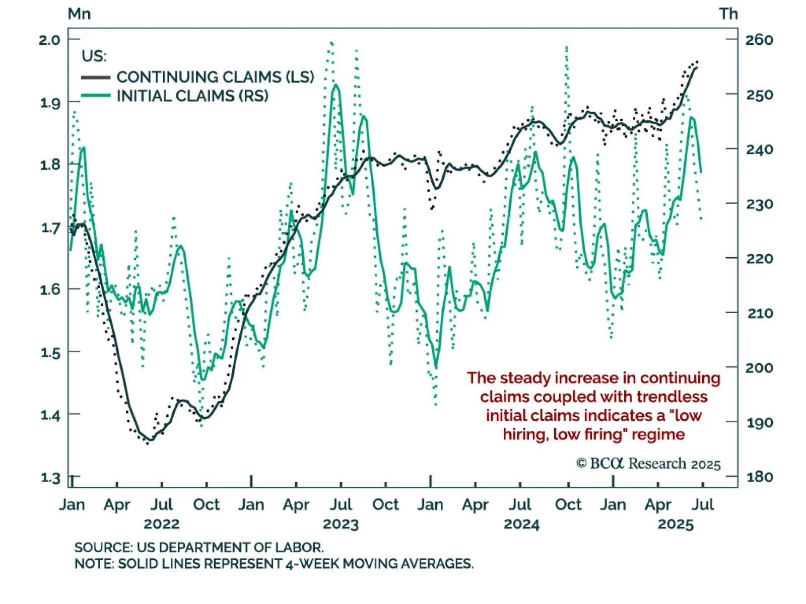 Rising continuing claims and slowing hiring momentum reinforce our defensive allocation stance. Continuing claims have reached a post-COVID high of 1.965m, while initial claims eased to 227k after peaking at 250k. The divergence…