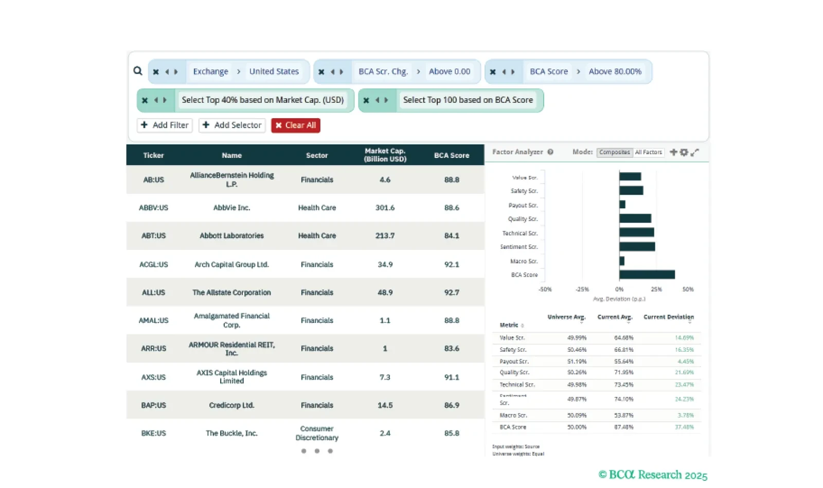 This week, our three screeners show you how to setup easy monitoring of the BCA Score, take advantage of earnings season in the US, and seek out global stocks that are cheap and high quality.