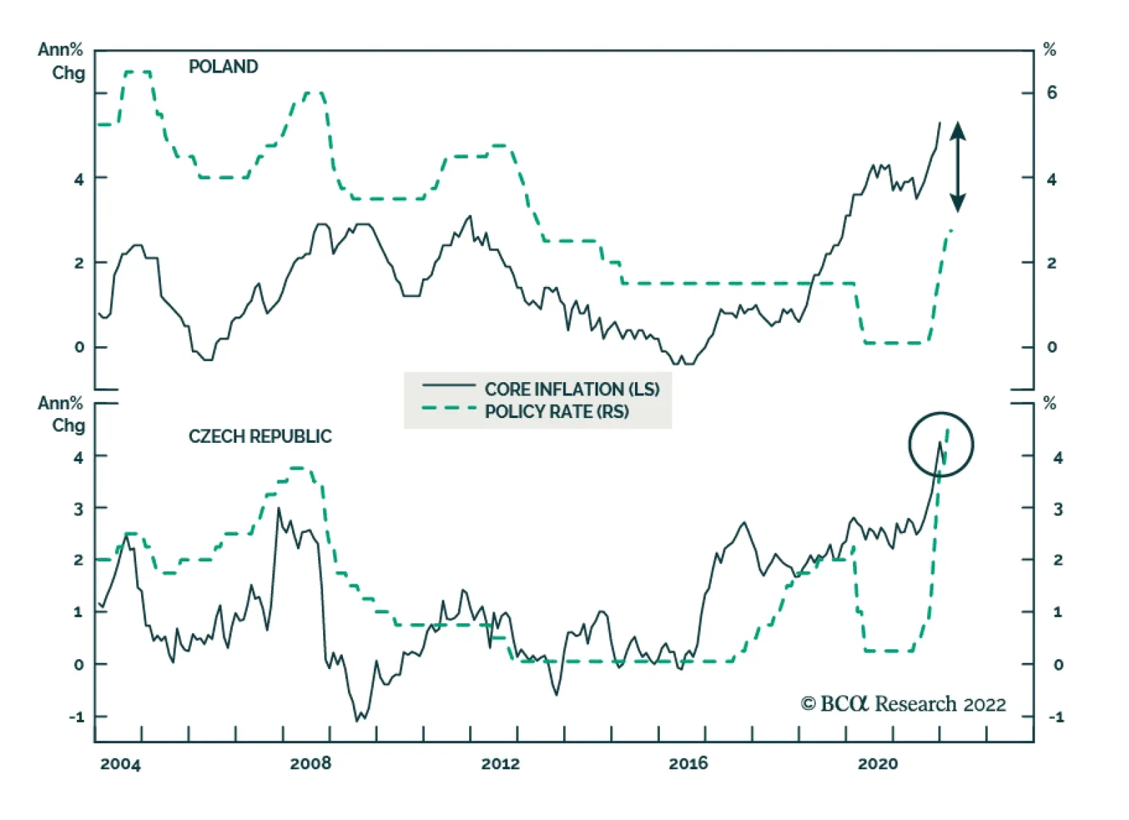 BCA Research’s Emerging Markets Strategy service recommends investors pay Polish / receive Czech 10-year swap rates. The Czech National Bank (CNB) has hiked its policy rate by 425 bps since June 2021. This has produced…