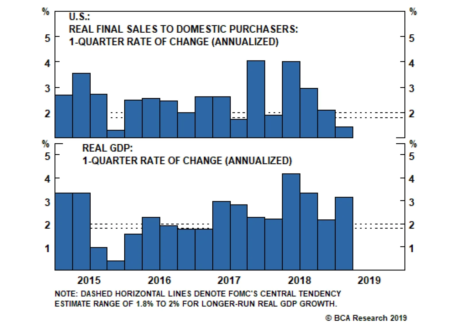 If growth runs close to or somewhat above its potential and inflation builds momentum, then some further rate increases may be appropriate over time… In contrast, if activity softens more than expected or if inflation and inflation expectations run too low, then policy may have to be left on hold – or perhaps even loosened – to provide the appropriate accommodation to obtain our objectives. Our interpretation of the Fed’s reaction function is that it wants to maintain an accommodative monetary policy to ensure that inflation and inflation expectations move higher over time. However, it will consider monetary policy to be accommodative as long as GDP growth stays close to, or above, estimates of its potential rate. In other words, while the Fed is in no rush to tighten, we probably need to see a significant period of below-potential GDP growth before rate cuts are on the table. In his speech, Evans indicates that his personal estimate of potential GDP growth is 1.75%. The March Summary of Economic Projections shows that the central tendency of FOMC participant estimates is 1.8% - 2%. Our view is that U.S. growth will easily surpass this threshold in 2019, keeping rate cuts at bay. Tracking U.S. Growth Markets were caught off guard last week when we learned that real GDP grew 3.17% in the first quarter, above consensus estimates and well above the 1.8% - 2% potential growth threshold. However, the headline Q1 figure was flattered by significant gains in a few volatile GDP components. Chart 3Underlying Growth Slowdown