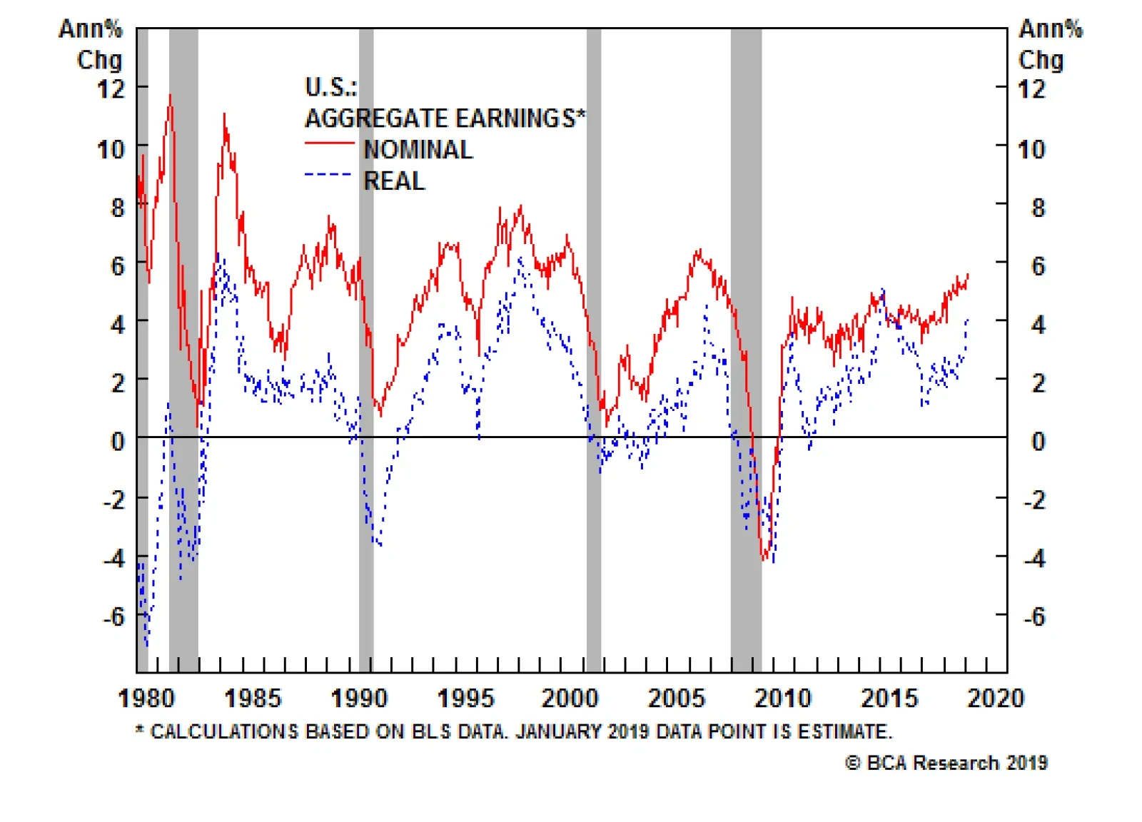 Cheer Up This leaves us with a striking conclusion: Perhaps the next U.S. recession is not around the corner, as some grumpy economists seem to think. Perhaps this economic expansion can endure beyond 2020. The recent U.S. data has certainly been consistent with that thesis. The ISM manufacturing index rose 2.3 percentage points to 56.6 in January. New orders jumped by 6.9 percentage points to 58.2. Payroll growth has also accelerated. Real aggregate earnings are up 4.2% from a year earlier, the fastest pace since October 2015 (Chart 14). Chart 14U.S. Labor Income Growth Has Been Accelerating