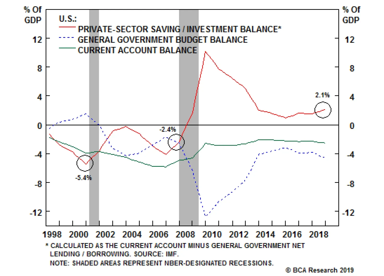 Tellingly, the distress in corporate debt markets in 2015-16 did not cause the financial system to seize up, as evidenced by the fact that financial stress indices only increased marginally during that period. This suggests that financial imbalances never had a chance to rise to a level that threatened the overall economy. The Preconditions For The Next U.S. Recession Are Not Yet In Place Today, the U.S. private-sector financial balance – the difference between what the private sector earns and spends – stands at a healthy surplus of 2.1% of GDP. Both of the last two recessions began when the private-sector balance was in deficit (Chart 3). Chart 3The Private Sector Is Not Living Beyond Its Means The Way It Was Before The Last Two Recessions