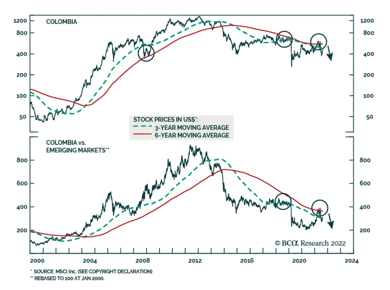 Inflation is not about oil, food or used car prices. Looking at prices of individual components of a consumer basket is akin to missing the forest for the trees. Despite the latest drop in US headline inflation, various core CPI measures continue trending up and registered considerable month-on-month rises in July. Wages and, more specifically, unit labor costs are the true measure of genuine and persistent inflation. US wage growth is very elevated, and the pace of unit labor cost gains has surged to a 40-year high. The conditions for sustainable and persistent disinflation in the US are not yet present. US inflation will prove to be much stickier and more entrenched than many market participants presently believe. The recovery in China will be U- rather than V-shaped, with risks tilted to the downside. The mainland’s property market breakdown is structural, not cyclical. Excesses are very large, and problems are snowballing, rendering the enacted policy stimulus insufficient. Bottom Line: US core inflation lingering above 4% and easing financial conditions will compel the Fed to continue hiking rates. This will cap global risk asset prices and put a floor under the US dollar. We continue to recommend an underweight allocation to EM in global equity and credit portfolios. Consistently, we are also reluctant to chase EM currencies higher. Feature The bullish macro narrative circulating in the investment community is that conditions for a cyclical rally in global risk assets have fallen into place. Specifically: US inflation will drop sharply as US growth has crested and commodity prices have plunged; The Fed is nearing the end of a tightening cycle; China has stimulated sufficiently, and its economy is about to recover, which will boost economic conditions among its trading partners in general and EM in particular. These assumptions along with the fact that the S&P 500 index has found support at a 3-year moving average – a proven line of defense – suggest that US share prices have likely bottomed (Chart 1). Are we witnessing déjà vu of the 2011, 2016, 2018 and 2020 market bottoms? Chart 1Déjà Vu? Is 2022 Like The 2011, 2016 And 2018 Bottoms In The S&P 500?