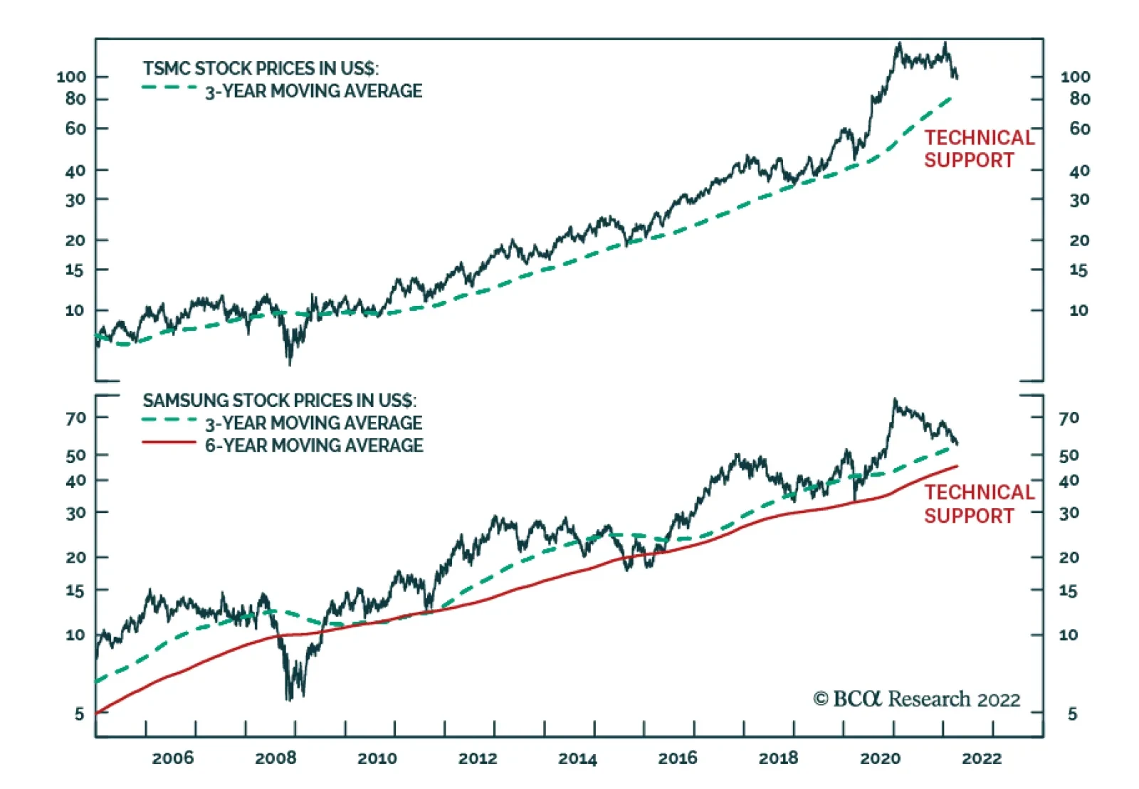 BCA Research’s Emerging Markets Strategy service expects Taiwanese and Korean semi stock prices to continue falling in absolute terms. Interestingly, since early 2021 TSMC and Samsung share prices have exhibited different price…