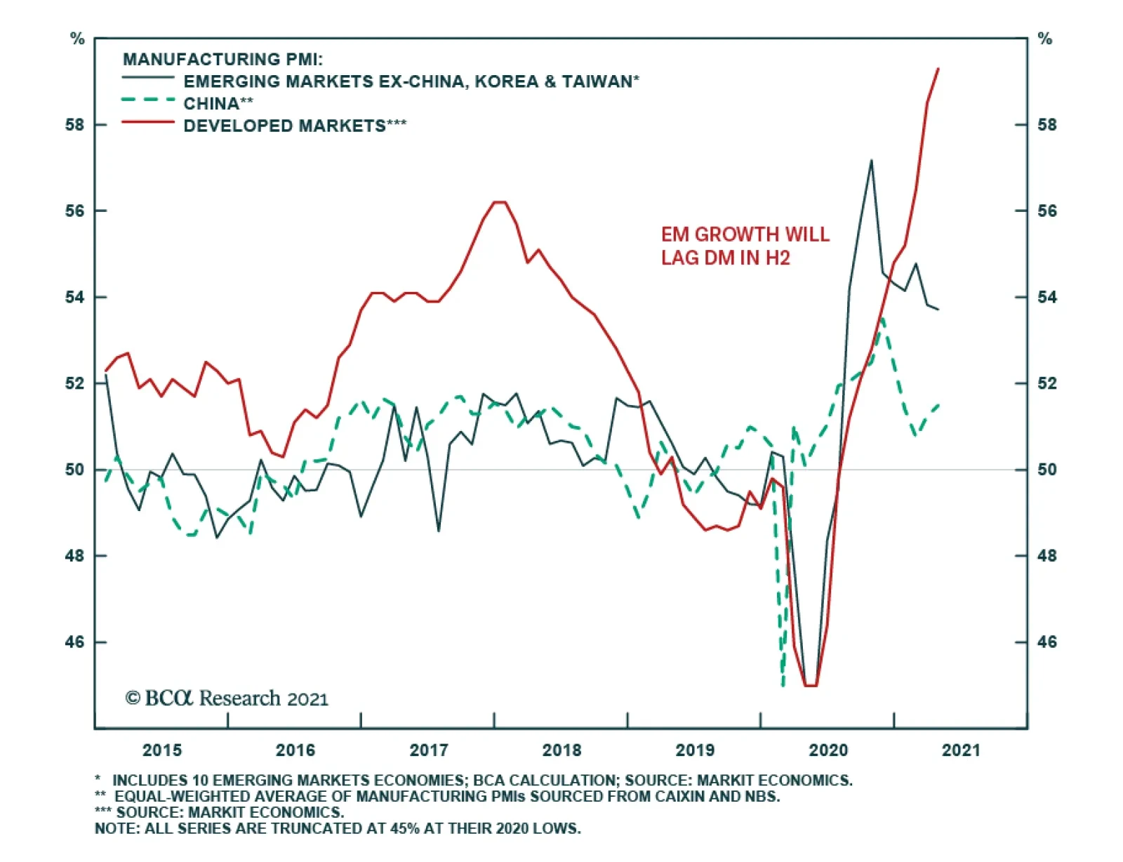 Recent manufacturing PMI releases suggest that emerging market growth will lag developed market peers in H2 2021. EM underperformance will stem from hard policy constraints and a slowdown in China’s “old economy”. First, DM policymakers have…