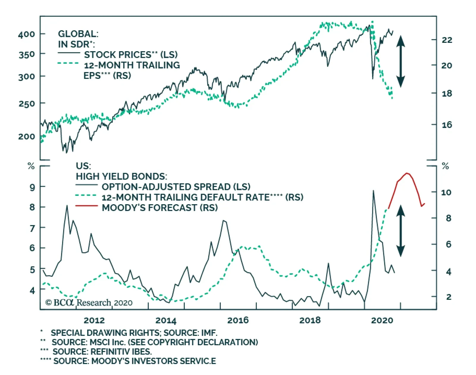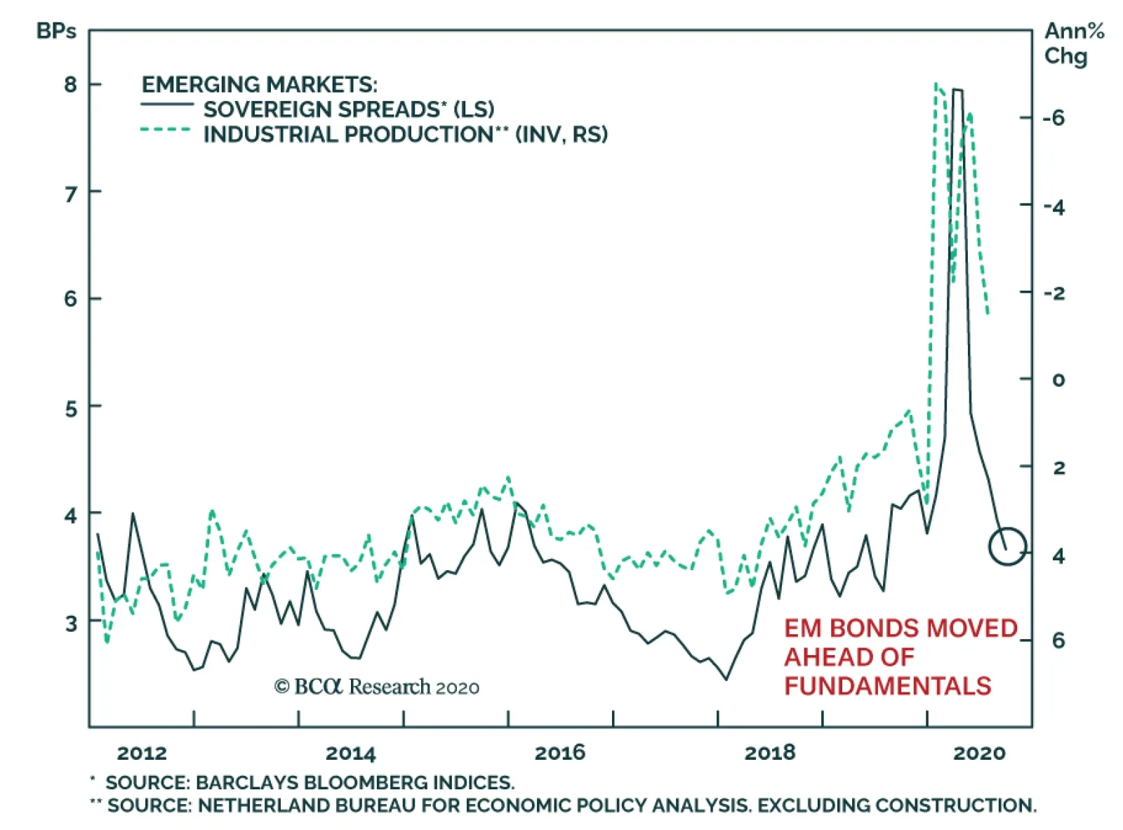 Highlights US market risks stem from both the lack of fiscal stimulus before the new president assumes office in late January. Risk-off moves in US financial markets will weigh on EM. China’s stimulus has peaked and the country has begun a destocking phase in commodities inventories. These factors could add to investor worries reinforcing the pullback in commodities prices and EM currencies. The key risks to our strategy are that financial markets might look through the lack of US fiscal stimulus in the next several months and ignore the commodity destocking cycle in China. This will be the case if investors instead focus on the US and China’s benign growth outlook over the next nine months. In that regard, we are positive too. Hence, the difficulty is to navigate markets in the near-term. If EM risk assets and currencies prove resilient in the short term, we will upgrade our stance sooner than later. Feature Global risk assets are vulnerable as US Republicans and Democrats have failed to agree on a new round of fiscal stimulus. The odds of enacting significant stimulus legislation – including income support for the unemployed – before the new president assumes office in late January are low. Global risk assets will suffer due to their dependence on continuous government stimulus. The rally since late March has created an air pocket, somewhat disconnecting risk asset prices from their fundamentals. In particular, the gaps between share prices and corporate earnings and between corporate spreads and projected corporate default rates have widened dramatically (Chart I-1). We do not mean that corporate earnings will not recover. Our point is that share prices have risen too far, too fast. Absent a large fiscal stimulus package in the US, risk asset prices will likely experience a meaningful setback. These gaps have been sustained by hopes of continuous fiscal and monetary stimulus. However, absent a large fiscal stimulus package in the US, risk asset prices will likely experience a meaningful setback. We continue recommending EM investors maintain a defensive positioning for now. Asset allocators should remain neutral on EM equities and credit within their respective global portfolios. In the near term, EM currencies will depreciate against the US dollar. We continue shorting a basket of EM currencies versus the euro, CHF and JPY. These DM currencies are likely to experience some, but not substantial, downside versus the greenback. Elevated Expectations Economic growth expectations are rather elevated and investor sentiment is complacent: The Global ZEW expectations index – based on a survey of analysts from banks, insurance companies and finance departments from the corporate sector – is close to an all-time high (Chart I-2). This implies that investors’ and analysts’ growth expectations are substantially inflated. Chart I-1The Rally Has Been Too Fast, And Gone Too Far