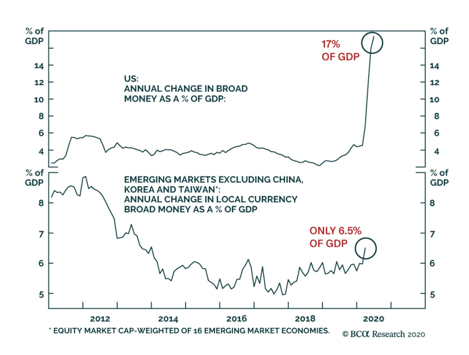 Highlights Historically, soft-budget constraints have typically been followed by periods of poor equity market performance. Soft-budget constraints could produce two distinct economic scenarios: malinvestment or inflation. Both are negative for equity investors. Odds are that the US will continue to pursue easy money policies, sowing the seeds of US equity underperformance in the years ahead. In contrast to the US, EM (ex-China, Korea and Taiwan) are presently facing hard-budget constraints, which will weigh on their growth in the near term. However, forced restructuring could boost efficiency and productivity leading to their equity and currency outperformance in the coming years. Unlike other developing economies, China is not currently facing hard-budget constraints. However, the structural overhang from the past 10 years of soft-budget constraints is lingering on and in some cases is increasing. The Thesis The consensus in the investment industry is that cheap money and ample stimulus are good for share prices. We do not disagree with this thesis when it is applied to the near and medium-term equity strategy. However, excessive stimulus and easy money policies — we refer to these as soft-budget constraints — bode ill for share prices in the long run. The investment relevance of this thesis is as follows. Since March, the US has implemented the largest fiscal and central bank stimulus in the world and will likely continue doing so in the coming years (Chart I-1). Such soft-budget constraints will likely support the US economy for now. Nevertheless, they will also sow seeds of future US equity underperformance and currency depreciation. Conversely, many emerging economies (excluding China) have failed to provide sufficient fiscal and credit support to their economies (Chart I-2). The resulting hard-budget constraints will foreshadow their economic underperformance vis-à-vis the US in the coming months. Chart I-1Soft-Budget Policies Will Likely Become Structural In The US