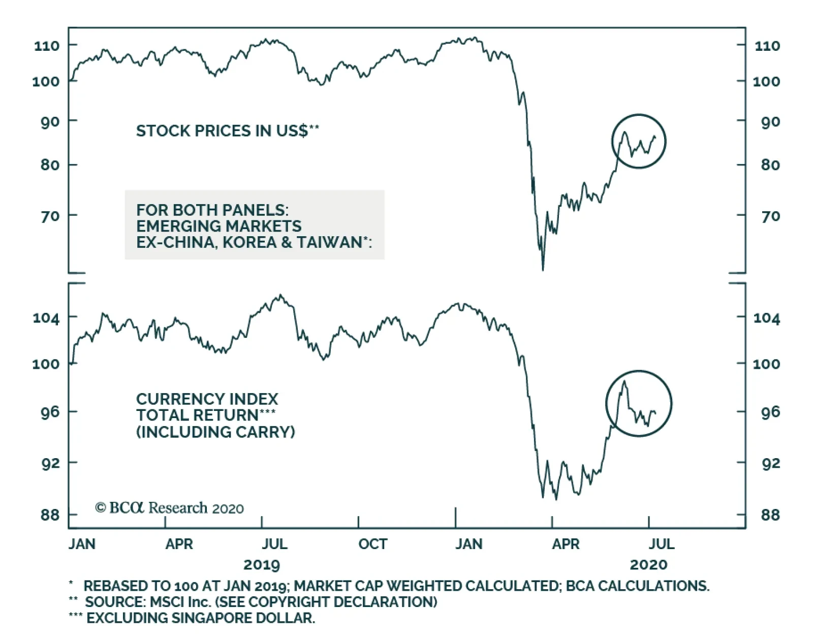 The basis is two-fold: First, banks saddled with non-performing loans are reluctant to bring down their lending rates and lend more; and second, the considerable decline in EM inflation has pushed up real lending rates (Chart I-9). The third variable driving EM financial markets – the S&P 500 – remains at risk of a material setback. If the S&P drops more than 10 or 15%, EM stocks, currencies and credit markets will also sell off markedly. Finally, there is the fourth aspect of the EM view – geopolitics – which could be critical in the coming months. The US-China confrontation will likely heighten leading up to the US elections. This will likely involve North and South Korea and Taiwan. Chart I-10EM ex-China, Korea And Taiwan: Stocks And Currencies