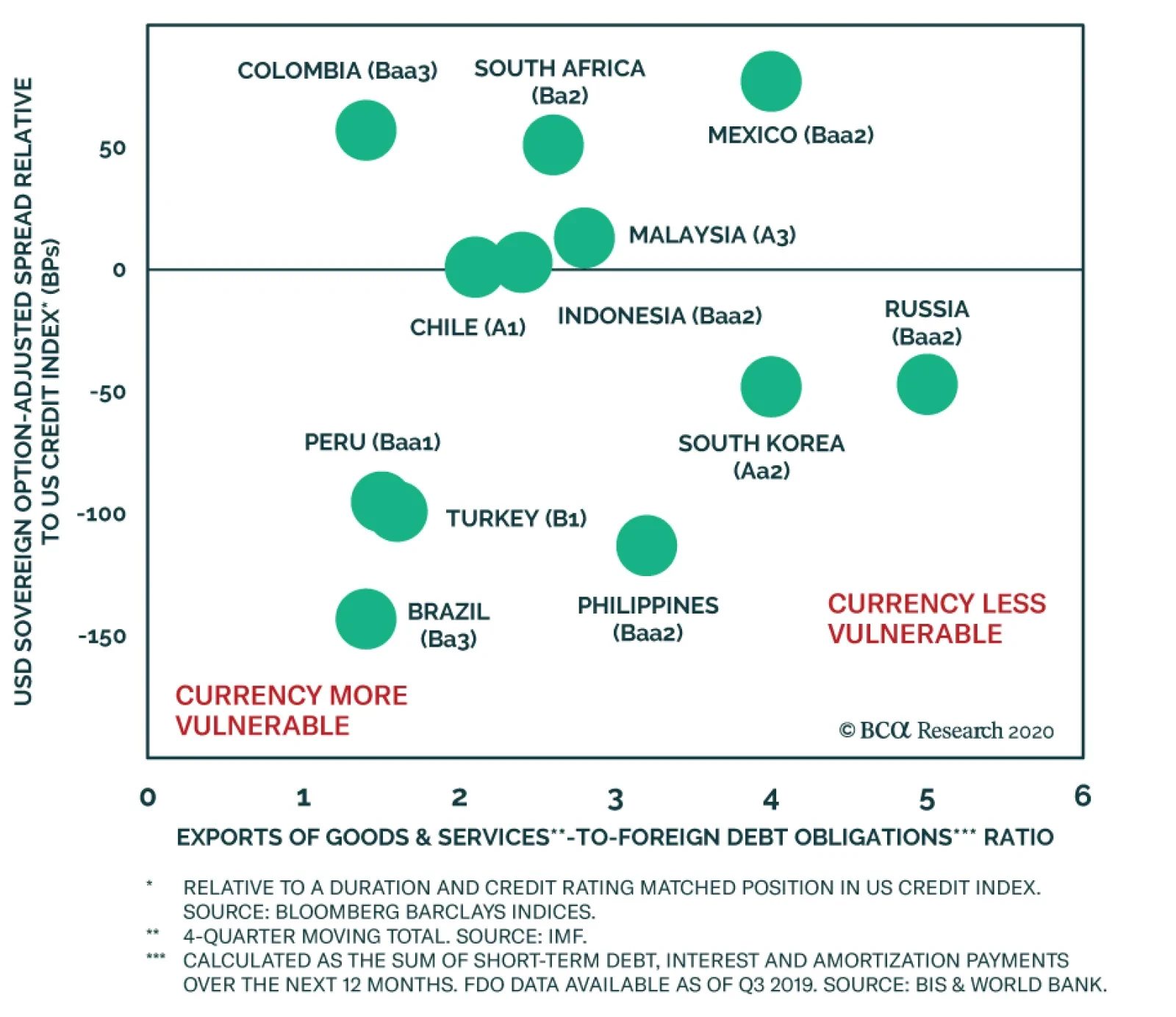 Currency is important for EM sovereign spreads because a stronger local currency literally makes US dollars cheaper for the EM nation to acquire. This, in turn, makes its USD-denominated debt easier to service, leading to tighter spreads. Chart 6 shows that EM Sovereign excess returns versus US Treasuries closely track EM currency performance. We also observe a strong link between EM currencies and high-frequency global growth indicators like the CRB Raw Industrials commodity price index (Chart 6, bottom panel). Based on this, we would only expect EM currencies to strengthen when global demand starts to pick up. Further, as our Emerging Market strategists wrote in a recent report, EM central banks are behaving differently during this recession than they have in past downturns.8 In the past, EMs would often run relatively tight monetary policies in order to fend off currency depreciation in the hopes of preventing capital outflows. This time, EM central banks are cutting rates aggressively, allowing their currencies to depreciate but supporting domestic demand. This is bearish for EM currencies and sovereign spreads in the near-term, but will probably lead to stronger economic recovery down the road. At the country level, we assess how vulnerable each country’s currency is to further depreciation by looking at its ratio of exports to foreign debt obligations.9 This ratio is a measure of US dollars coming in over a 12-month period relative to 12-month US dollar debt obligations. It has a relatively tight correlation with the dollar-denominated sovereign spread (Chart 7A). Low-rated countries, like Turkey and South Africa, have relatively low export coverage of foreign debt obligations, while Russia and South Korea have relatively strong debt coverage. Combining Valuation & Currency Outlook Chart 7B shows the same measure of currency vulnerability on the horizontal axis, but shows EM spreads relative to duration and credit rating matched US corporate credit on the vertical axis. Here, we see that Russia offers poor valuation, but a relatively safe currency. Meanwhile, Colombia offers an attractive spread but has a poor currency outlook. In this chart, Mexico stands out as the most attractive on a risk/reward basis. Chart 7AEM Sovereign Spread Versus Currency Vulnerability