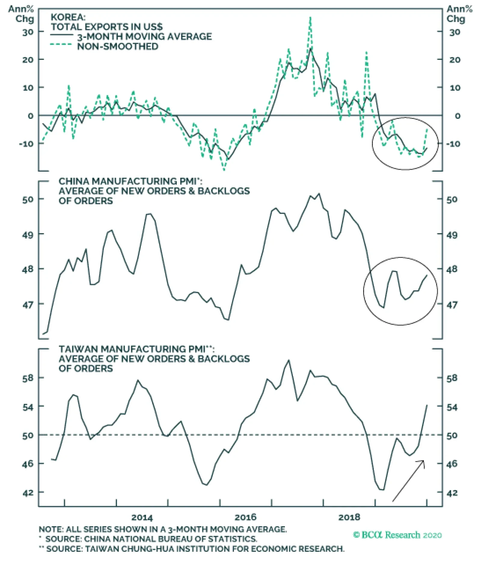 We would discount the ISM report to some extent. The regional Fed manufacturing indices have not been nearly as disappointing as the ISM (Chart 19). The Markit PMI, which tracks US manufacturing activity better than the ISM, clocked in at a respectable 52.4 in December, down only slightly from November’s reading of 52.6. Nevertheless, it is hard to be excited about the near-term outlook for US manufacturing, especially in light of Boeing’s decision to suspend production of the 737 Max temporarily. Most estimates suggest that the production halt will reduce real US GDP growth by 0.3%-to-0.5% in the first quarter. The euro area manufacturing PMI gave up some of its November gains, falling to 46.3 in December. While the index is still above its September low of 45.7, it has been under 50 for 11 straight months now. The UK and Japanese PMI also retreated. Chinese manufacturing has shown clearer signs of bottoming out. Despite dipping in December, the private sector Caixin manufacturing PMI remains near its 2017 highs. The official PMI published by the National Bureau of Statistics is less upbeat, but still managed to come in slightly above 50 in December. The production subcomponent reached the highest level since August 2018. Reflecting the positive trend in the Chinese economy, Korean exports to China rose by 3.3% in December, the first positive growth rate in 14 months (Chart 20). Taiwan’s exports have also rebounded. The manufacturing PMI rose above 50 in both economies in December. In Taiwan’s case, this was the first time the PMI moved into expansionary territory since September 2018. On balance, we continue to expect global manufacturing to recover in 2020. This is in line with our observation that global manufacturing cycles typically last three years, with 18 months of weaker growth followed by 18 months of stronger growth (Chart 21). That said, the weakness in European and US manufacturing (at least judged by the ISM) is likely to give investors pause. Chart 20Some Positive Signs Emerging From Korea And Taiwan