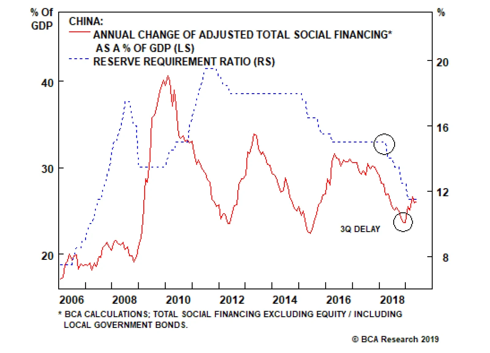 In our view, the PBoC’s policy actions last year can at best be described as half-measures, despite the fact that the central bank was quick to reduce interbank interest rates in last July by cutting the reserve requirement ratio (RRR). The reason is that the PBoC clearly maintained macro-prudential/administrative restrictions on shadow banking activity, despite significantly easing liquidity in the interbank market. Chart 4 shows that shadow-banking credit as a share of total adjusted social financing continued to decelerate rapidly throughout 2018. It now accounts for a mere 12% of the stock of total adjusted social financing, by far the lowest point since 2009. This underscores that the PBoC and policymakers more generally have a deep-seated desire to avoid (further) inflating China’s substantial money and credit excesses – a dynamic that we have discussed in previous reports.1 Looking forward, there are three reasons why the PBoC’s reactive nature is unlikely to change in the near term, in addition to policymakers’ concerns about financial system’s excesses. First, the PBoC has historically been a reactive central bank, in a way that goes beyond the now-typical “data dependent” approach of its developed-market peers. Chart 5 provides a close look at China’s previous economic growth cycles and their corresponding credit expansions. The chart highlights that Chinese policymakers tend to stay behind the curve when it comes to monetary easing: In the previous three growth cycles, the first sign of monetary easing (defined as an RRR and/or benchmark lending rate cut) lagged the peak of nominal GDP growth by an average of four quarters. Rate cuts took place not when economic growth peaked, but once economic activity had already weakened considerably (Chart 6). Chart 5Chinese Policymakers Tend To Stay 'Behind The Curve'
