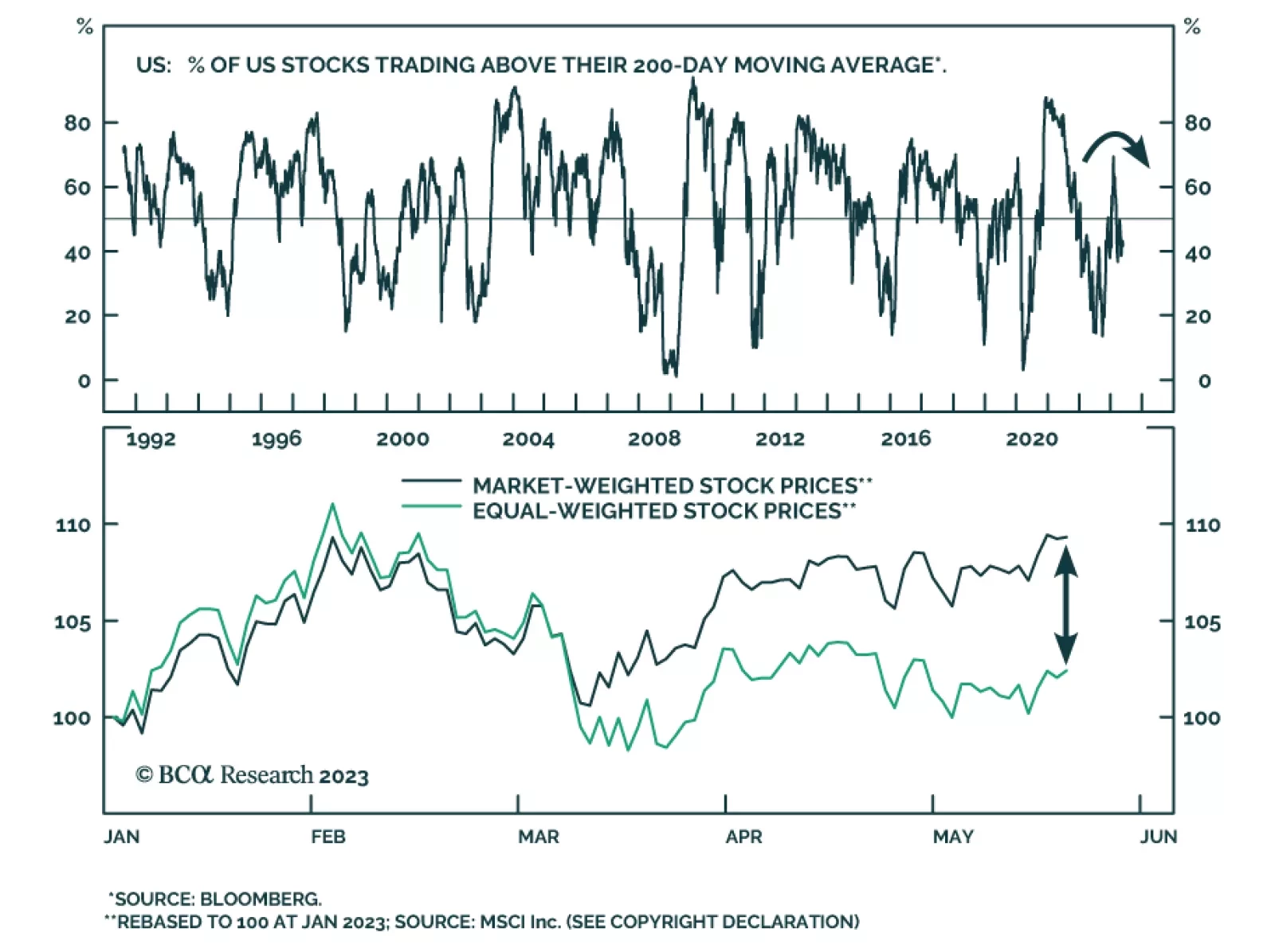 In Section I, we review the three possible economic scenarios over the coming year, and underscore that the “soft landing” scenario remains improbable. A “no landing” scenario could occur, but it would ultimately lead back to the recessionary path and thus is not a basis for investors to maintain pro-risk portfolio positions. US stock prices continue to be buoyed by rate cut expectations, but nonrecessionary cuts still appear to be a long way off. In Section II, we present our best estimate of the inflationary threshold that results in a positive or negative stock price / bond yield (SBY) correlation, and whether investors are likely to approach this level over the coming one-to-two years. US core inflation does not likely need to return to the Fed’s target in order for the SBY correlation to return to positive territory, but a move back to a positive correlation will very likely occur in the context of falling equity prices.