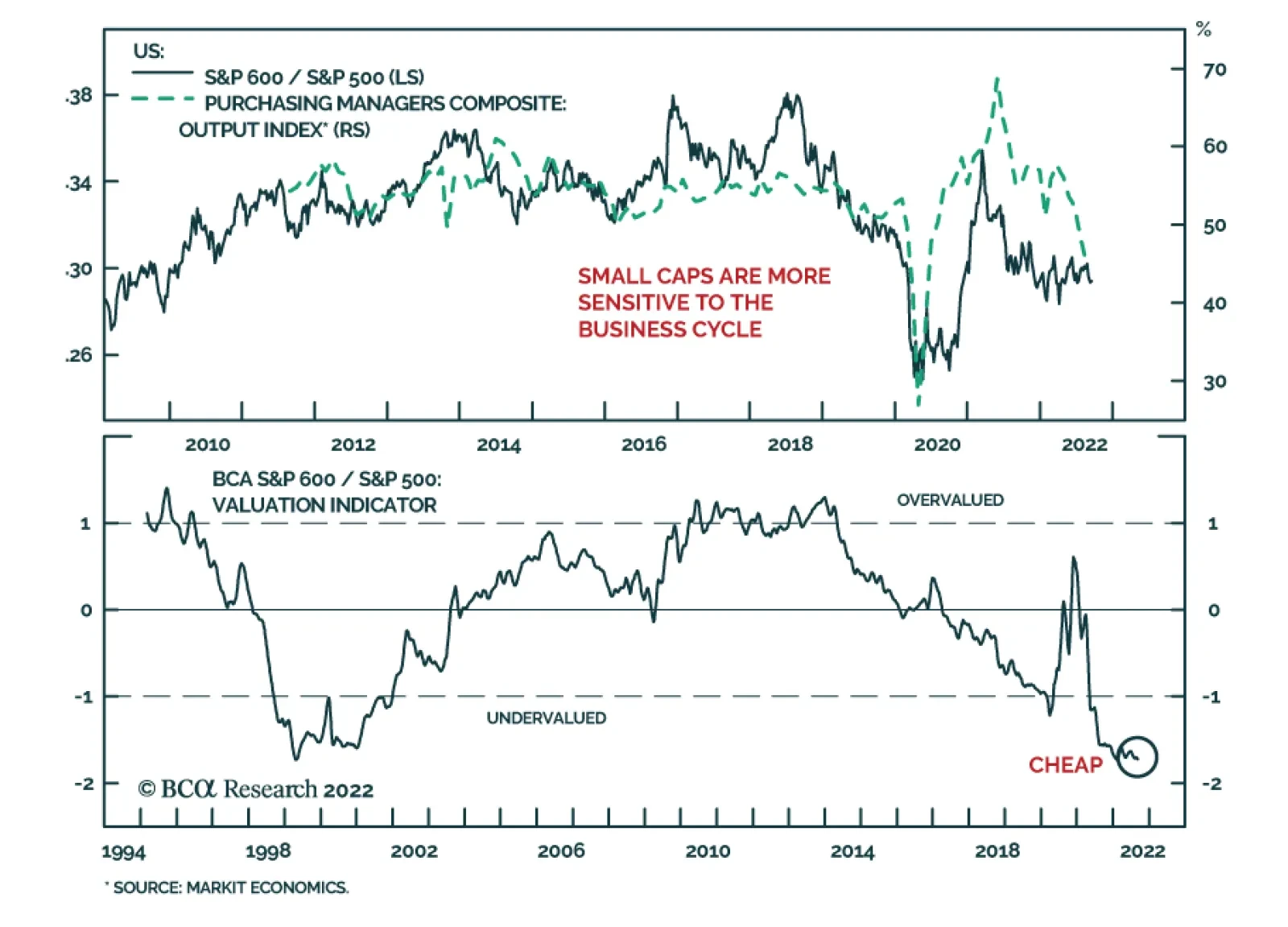 US small cap equities have performed broadly in line with their large cap peers so far this year, with both the S&P 500 and S&P 600 down nearly 14% by Monday’s close. Small caps are typically more sensitive to the business cycle. Indeed, in the…
