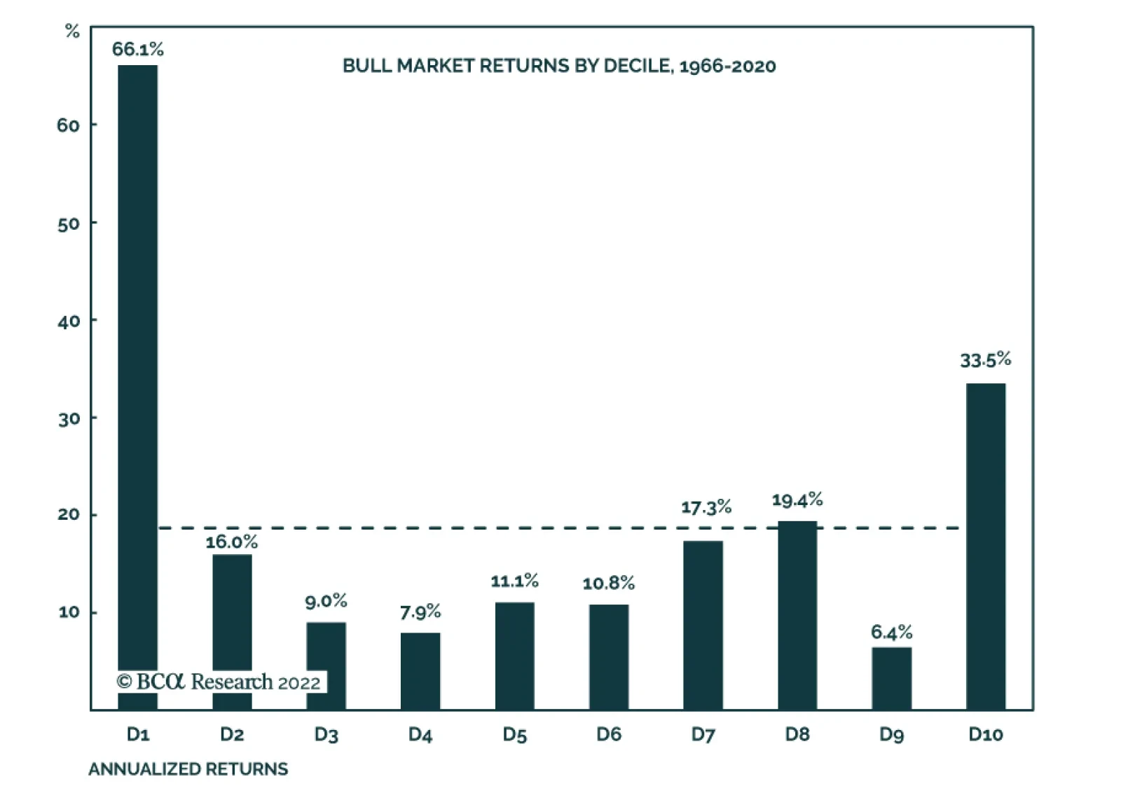 Our US Investment strategists have shown that bull markets – defined as the period between two NBER-designated recessions – have the tendency to start off with a bang, and sprint to the finish line. A decomposition into deciles of the nine bull markets…