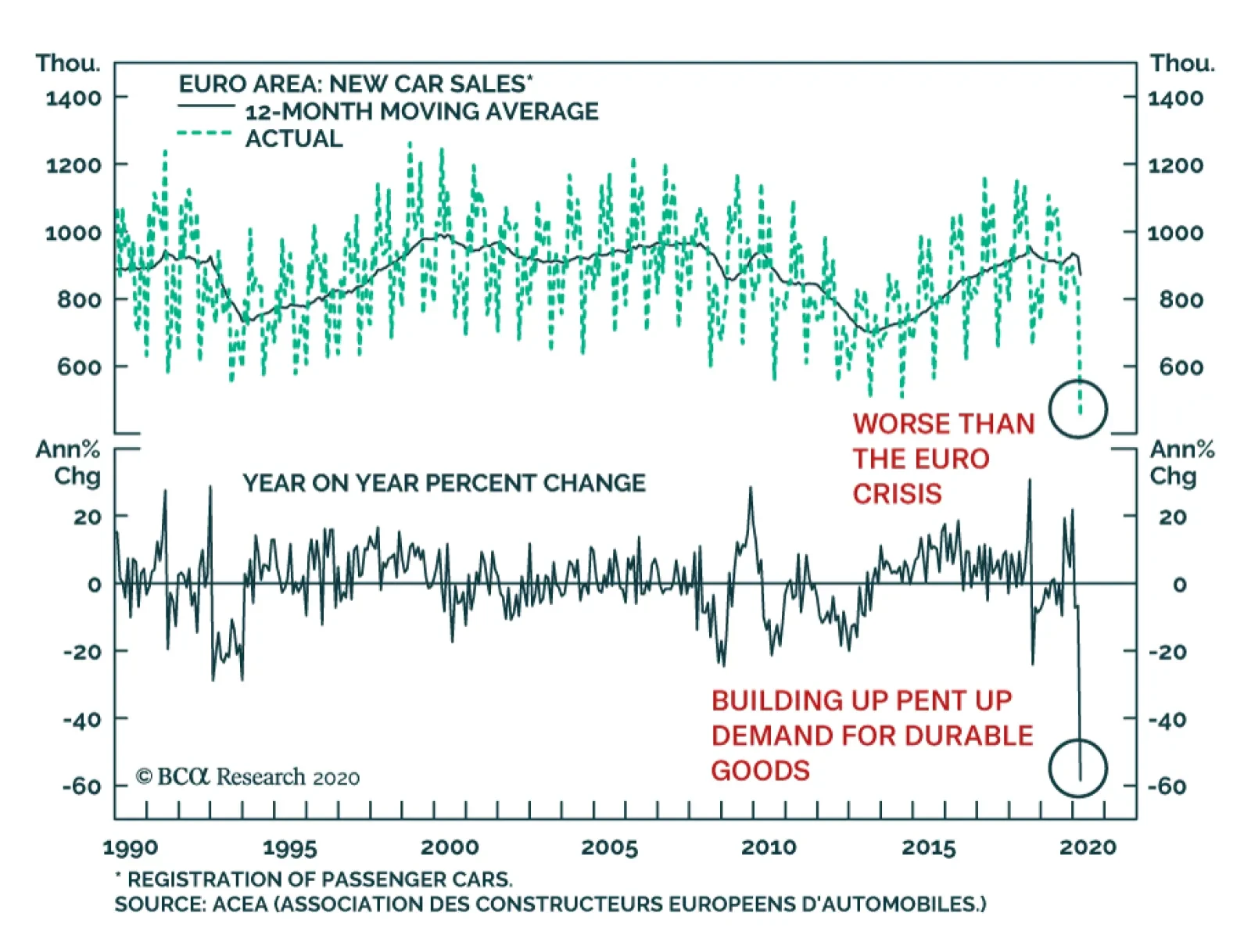 In March, European car registrations collapsed 55% on an annual basis. This indicates that European growth will be extremely negative in Q1 2020. While this contraction is stunning, it is a logical consequence of lockdowns: very few people will buy a car…
