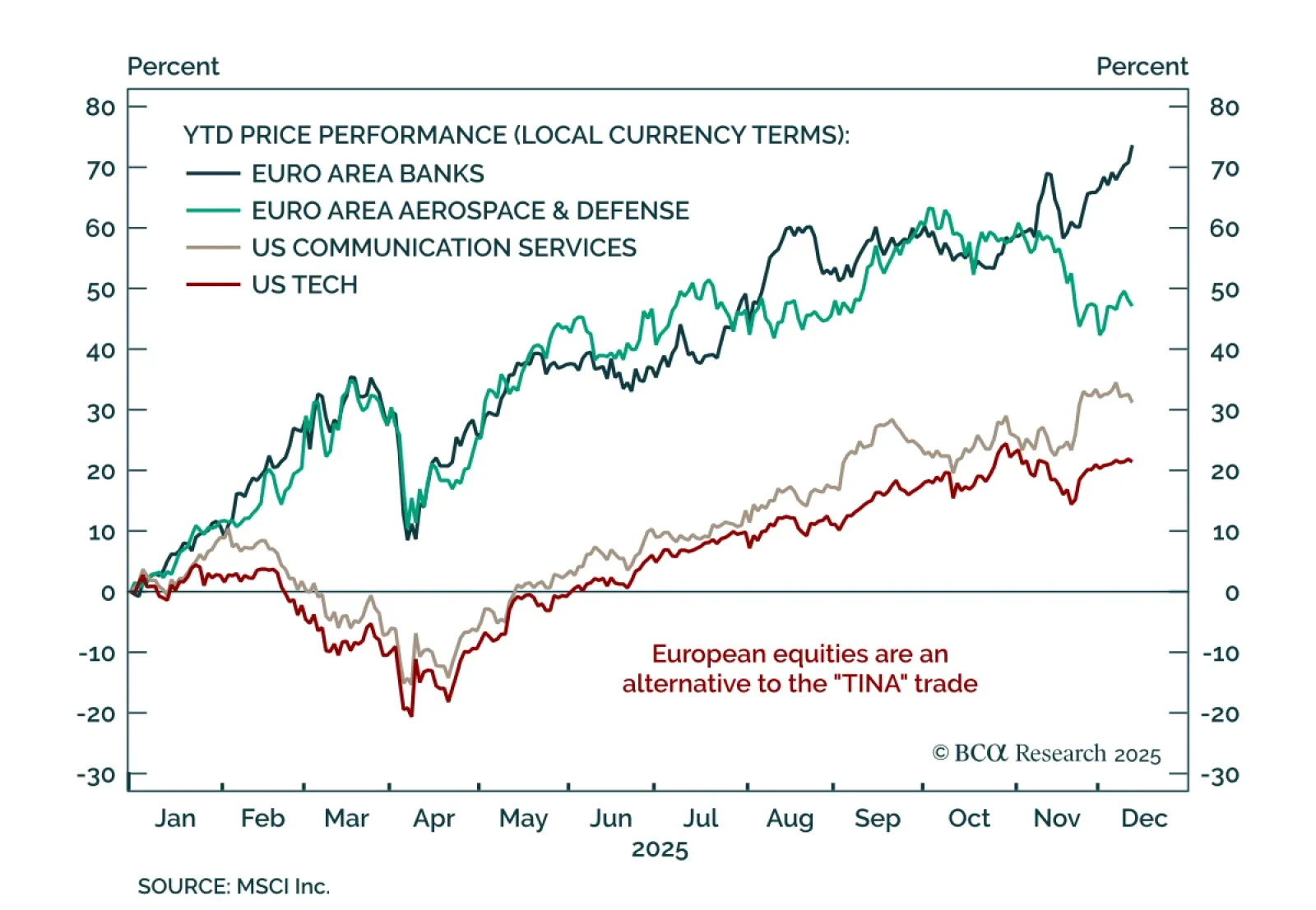 Europe’s equity outperformance is real, and even stronger once adjusted for FX. Our Chart Of The Week comes from Jeremie Peloso, Chief European Investment Strategist. Banks and defense stocks (not tech and communication services…
