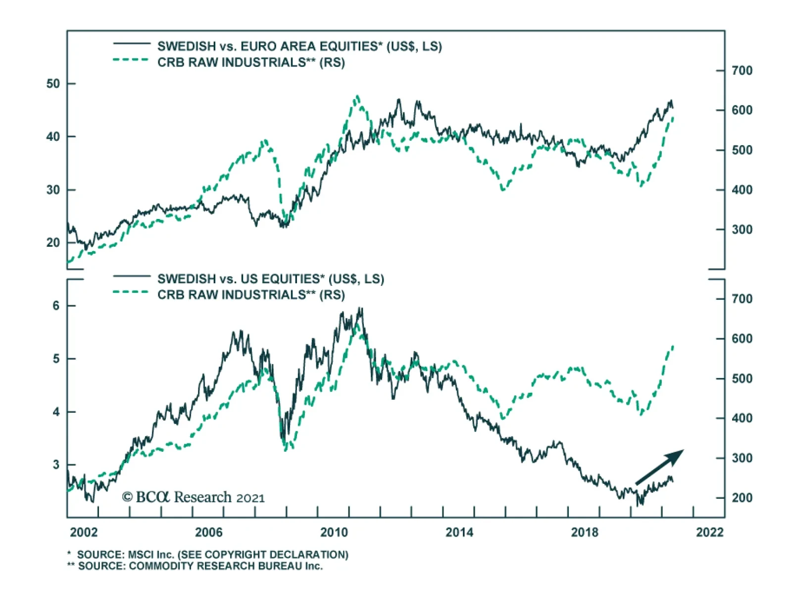 Over the coming 12 to 24 months, cyclical forces favor selling EUR/SEK and USD/SEK on any strength. The SEK is one of the most cyclical G-10 currencies and has one of the strongest sensitivities to the US dollar. Hence, our positive global economic outlook and our FX strategists negative view on the greenback are synonymous with a weak USD/SEK. These same factors also mean that the krona will appreciate more than the euro, as the negative correlation between EUR/SEK and our Boom/Bust Indicator and global earnings growth illustrate (Chart 9). Equities We also like Swedish equities, but the state of the Swedish economy and the evolution of the Riksbank policy surprise have a limited impact on Swedish equities. The Swedish bourse is mostly about the evolution of the global business cycle. The Swedish benchmark heightened sensitivity to the global business cycle reflects its massive overweight in deep cyclicals, with industrials, financials, consumer discretionary, and materials accounting for 38.4%, 26.1%, 9.7% and 3.7% of the MSCI index respectively, or 78% altogether (Table 1). As a result, BCA’s preference for global cyclicals at the expense of defensives and this publication’s fondness for the recovery laggards like the industrial and financial sectors automatically translate into a favorable bias toward Sweden’s stocks.3 Table 1Mamma Mia! That’s A Lot Of Cyclicals