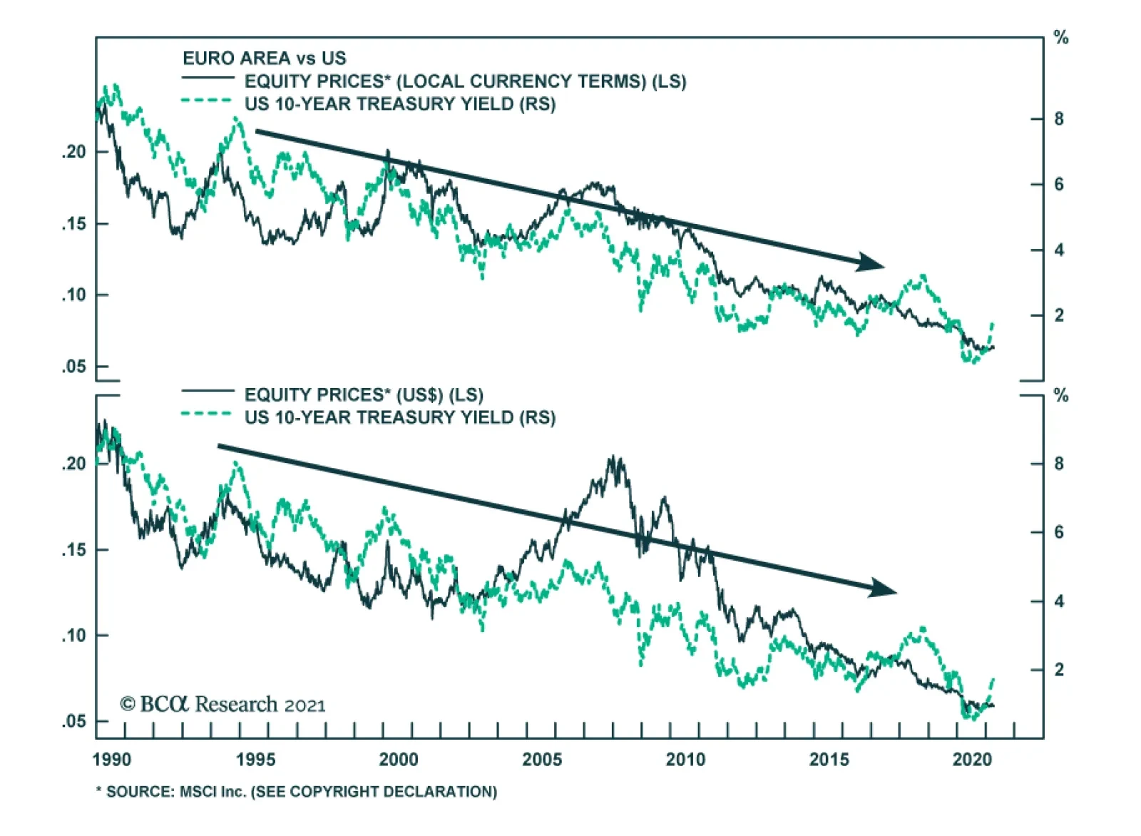 Highlights Structural headwinds are still too strong to hold a long-term bullish view on Eurozone equities relative to the US. However, the coming two years should be kind to euro area stocks. The relative performance of European stocks compared to that of the US is predominantly a function of yields. BCA foresees higher yields over a 24-month period. Moreover, European equities are exceptionally cheap, which accentuates their appeal as a yield play. Tactical considerations indicate that a modest overweight in European stocks, not an aggressive one, is most appropriate for cyclical investors. European investment grade bonds are appealing in a European fixed-income portfolio. Feature Chart 1Europe's Underperformance Explained