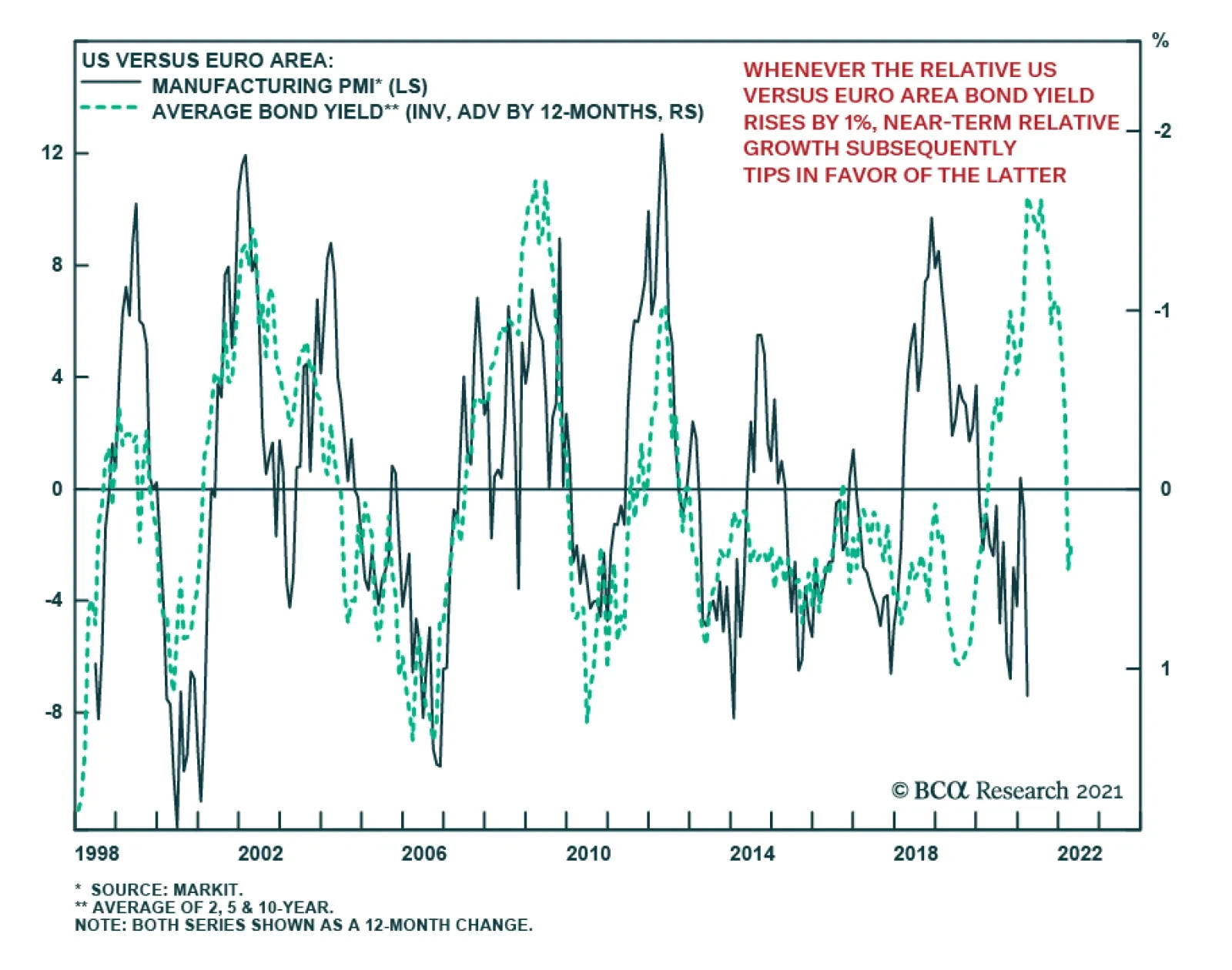 The US economy has been the growth outperformer this year. As such, yields have been rising faster in the US and the dollar has caught a bid. Since the start of the year, the DXY index has retraced 2.5% of its yearly losses against developed market currencies. Meanwhile, the rally has been a broad-based one with the euro, yen and Swedish krona taking the brunt of the decline (Chart I-1). Our bias is that growth outperformance will rotate from the US to the rest of the world later this year. This should hurt the dollar and benefit procyclical currencies. This week, we look at the euro and loonie, two currencies that should benefit from this shift. EUR/USD And The Manufacturing Cycle The relationship between bond yields and the economy is circular. Long bond yields can be regarded as a key signaling mechanism about the growth prospects of an economy. At the same time, bond yields directly affect financial conditions, especially when they rise too far too fast. From the point of view of short-term currency forecasting, determining the tipping point at which rising yields become restrictive could be extremely beneficial in forecasting relative economic growth. Chart I-2 shows that whenever the relative bond yield between the US and the euro area rises by 1%, near-term relative growth subsequently tips in favor of the latter, with a lag of about 12 months. This is important since the correlation between EUR/USD and relative growth is quite strong in the short term (Chart I-3). As such, while the rise in yields between the US and the euro area can hurt EUR/USD in the short term, it will begin to benefit relative euro/US growth in the longer term. Chart I-2Relative Bond Yields And The Manufacturing Cycle