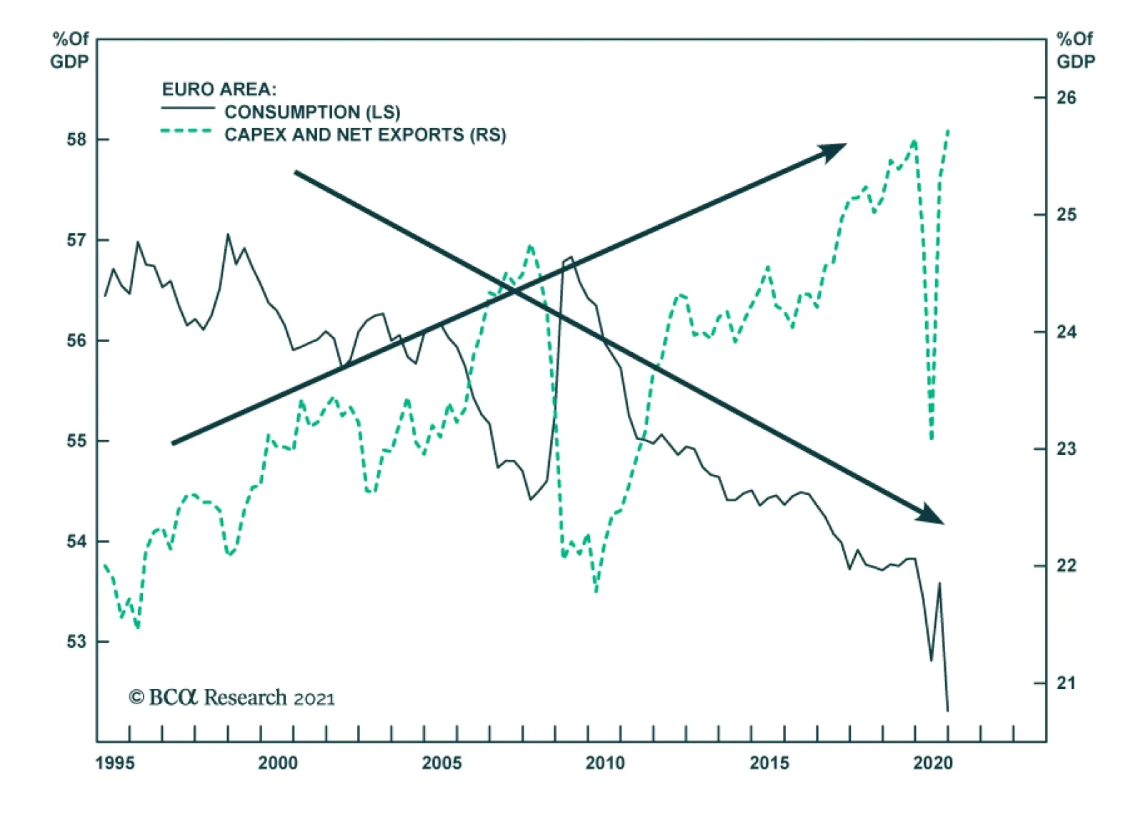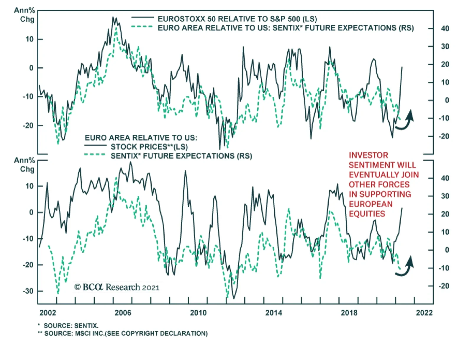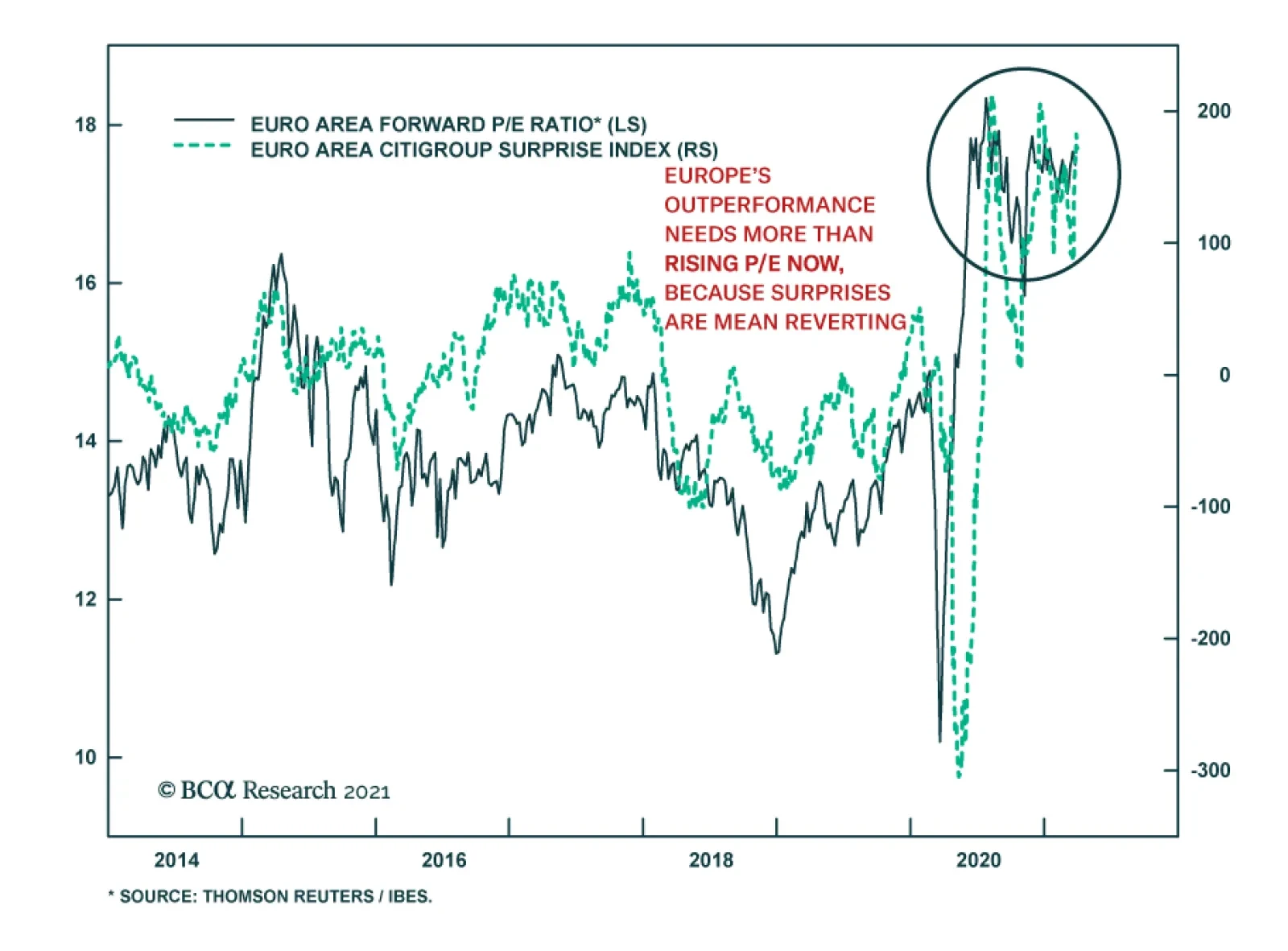 Highlights The Eurozone economy and assets remain beholden to the global manufacturing cycle. This sensitivity reflects the large share of output generated by capex and exports. Yet, the second half of 2021 and first half of 2022 could see euro area growth follow the beat of its own drum. This is a consequence of the unique role of consumption in the COVID-19 recession. European growth will therefore outperform expectations, even if economic momentum slows outside of Europe. Consequently, the euro and Eurozone equities will outperform for the coming 12 to 18 months. Feature For the past 20 years, investors have used a simple rule of thumb to understand European growth and markets. Europe is a derivative of global growth because of its large manufacturing sector and torpid domestic economy. A reductionist approach would even argue that China’s economy is what matters most for Europe. Is this model still valid to analyze Europe? In general, this approach still holds up well. However, the nature of the 2020 COVID-19 recession suggests that the European economy could still accelerate in the second half of the year, despite a small slowdown in the Chinese economy and global manufacturing sector. The Origin Of The Pro-Cyclicality Narrative Investors in European markets have long understood that Eurozone equities outperform when the global manufacturing cycle accelerates. This pro-cyclicality of European stocks is a consequence of their heavy weighting toward cyclical and value stocks, such as industrials, consumer discretionary and financials. Chart 1German/US Spreads: Global Manufacturing Cycle