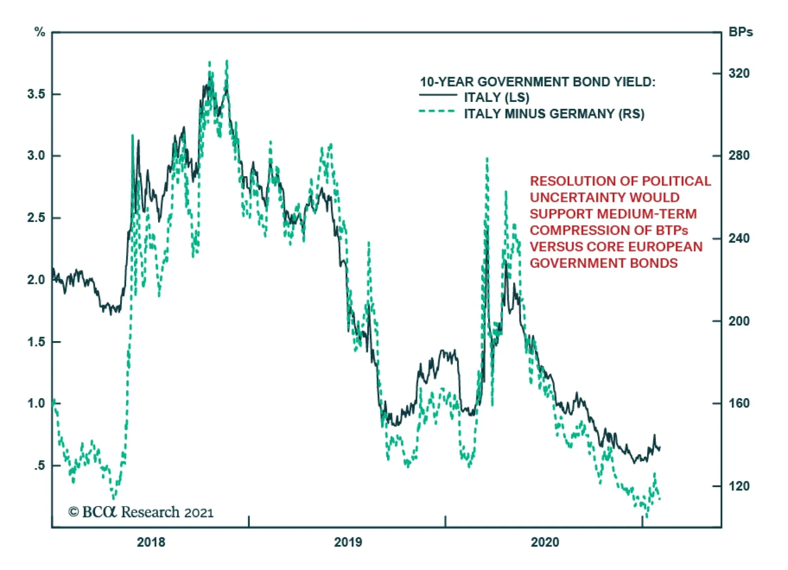 Structural reforms undertaken by the technocratic Mario Monti government in the wake of the sovereign debt crisis proved insufficient. Subsequent reform efforts went up in a puff of smoke when Matteo Renzi’s pro-reform constitutional referendum failed in 2016. Italy’s government is congenitally gridlocked because the lower and upper houses of the legislature have equal powers, like in the US, but its parliamentary governments can be easily toppled by either house. The 2016 constitutional reforms would have given the central government historic new powers to force through painful yet necessary structural changes – but centrist voters of different stripes hesitated to grant these new powers since they looked likely to go to populist parties on the brink of victory in the looming 2017 elections. The populists – the right-wing League in the north and the left-wing Five Star Movement in the south – did indeed come to power in 2017 but Italian’s political establishment subsequently restrained them from pursuing either serious euroskepticism or massive fiscal spending. Pro-establishment President Sergio Mattarella rejected any cabinet members who would attack the monetary union. Subsequent battles with Brussels and Germany prevented Italy from passing a blowout stimulus that challenged EU fiscal orthodoxy and threatened to precipitate a solvency crisis in the banking system. In 2019 the ambitious League broke with the Five Star Movement, which collaborated with the center-left Democratic Party to form a new coalition. But the resulting compromise government, its populism diluted, only managed one structural reform – to reduce the size of parliament – plus a moderate increase in government spending. The populist parties ended up being right about the need for more proactive fiscal policy, as Germany conceded in late 2019 and as COVID-19 lockdowns made absolutely necessary in early 2020. French President Emmanuel Macron and German Chancellor Angela Merkel agreed to launch a €750 billion EU Recovery Fund that enabled jointly issued debt for EU members, solidifying a proactive fiscal turn in the bloc. Italy now has €209 billion coming its way. This is a boon for the recovery, though it is also the origin of the politicking that brought down the ruling coalition last month. With central banks monumentally dovish, European and American fiscal engines firing on all cylinders, and China’s 2020 stimulus still coursing through the world’s veins, the macro backdrop is positive for Italy. But with Italy’s economy still shackled by fundamental flaws, it will not be a lead actor or an endogenous growth story. Bottom Line: Italy missed the chance in the 2010s to undertake structural reforms that could lift productivity and potential growth. Now it is struggling to maintain political order in the wake of a devastating pandemic and recession. The vaccine and global recovery will lift Italian assets but the future remains extremely uncertain, given the eventual need to climb down from extreme stimulus and impose painful structural reforms. Paradiso? Or Paradiso Perduto? The latest political turmoil arose over the EU Recovery Fund and how Italy will spend the €209 billion allotted to it, as well as the €38.6 billion allotted to the country under the EU’s structural budget for 2021-28. Ostensibly Matteo Renzi pulled his Italia Viva party out of the ruling coalition because he feared that former Prime Minister Conte, together with his economy and industry ministers, would spend the funds on short-term vote-winning handouts rather than long-term structural fixes in health, education, and culture. But Renzi was not appeased when Conte offered to spend more on health and education as requested. Renzi’s party fares poorly in opinion polls and the recent electoral reforms were not favorable to it, so he can hardly have wanted a new election. He wanted Italy to tap €36 billion from the European Stability Mechanism in addition to taking EU recovery funds, since this would come with strings attached in the form of structural reform. He apparently wanted to precipitate a new pro-establishment coalition. President Mattarella’s appointment of Mario Draghi to lead a national unity coalition is the solution. But as we go to press it is not certain that Draghi will be able to command a majority in parliament. Chart 8Salvini's League Lost Steam But Populist Right Still Powerful
