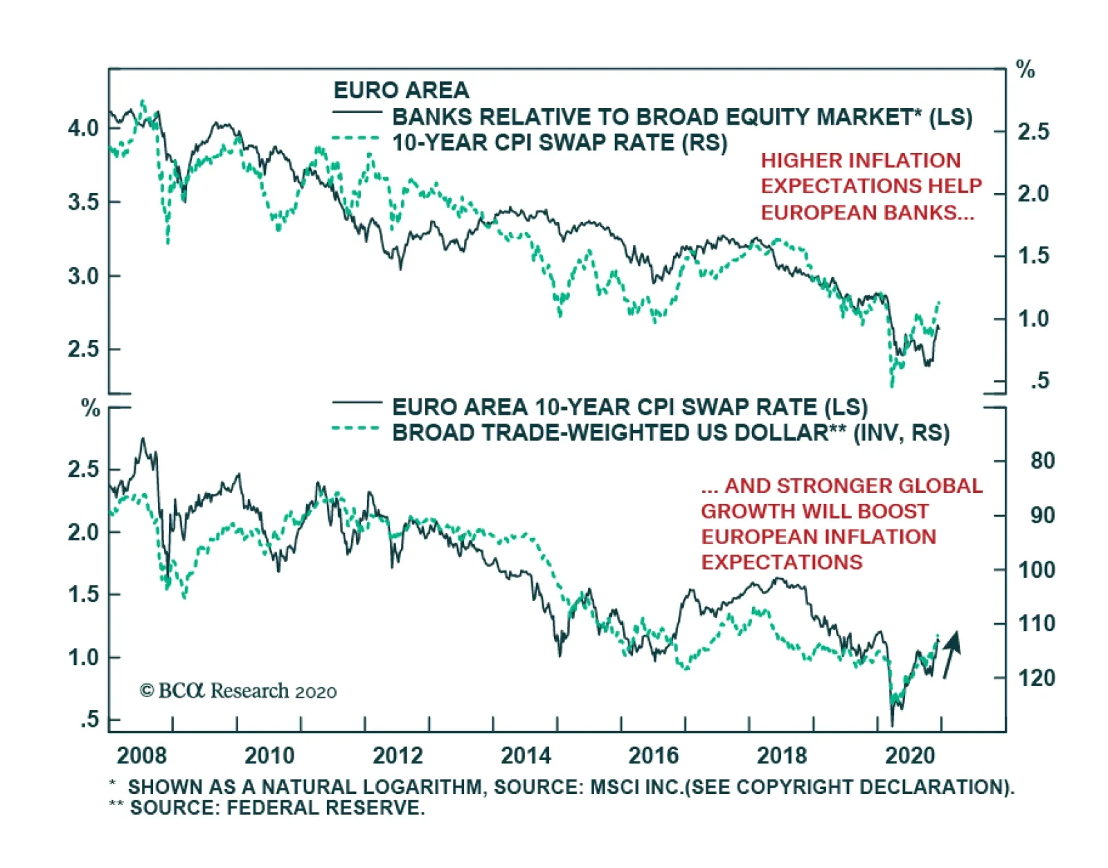 The performance of the Eurozone’s banks relative to the broad market follow the evolution of European inflation expectations. This relationship reflects many links. First, higher inflation expectations point toward higher nominal GDP growth, which at the…