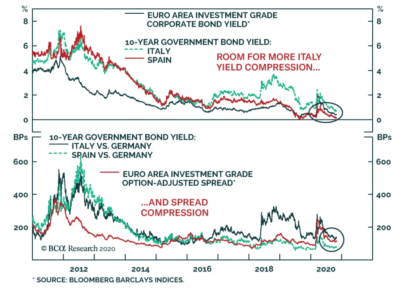 The Case For European Growth We tend to side with the IMF’s forecasts and even argue that this might actually be on the conservative side for the euro area. There are two major reasons for this, both of which are bilaterally important. First, the neutral rate of interest in the euro area may have moved a step function higher relative to the US. The standard dilemma for the euro zone is that interest rates have always been too low for the most productive nation, Germany, but too expensive for others, such as Spain and Italy. The silver lining is that the European Central Bank (ECB) has now lowered domestic interest rates and eased policy to the point where they are accommodative for all euro zone countries.1 Bond yields in peripheral Europe are collapsing relative to those in Germany and France (Chart 5). This makes it much easier for the less-productive, peripheral countries to borrow and invest. This will boost productivity, lifting the neutral rate. Chart 5The Neutral Rate In The Euro Area