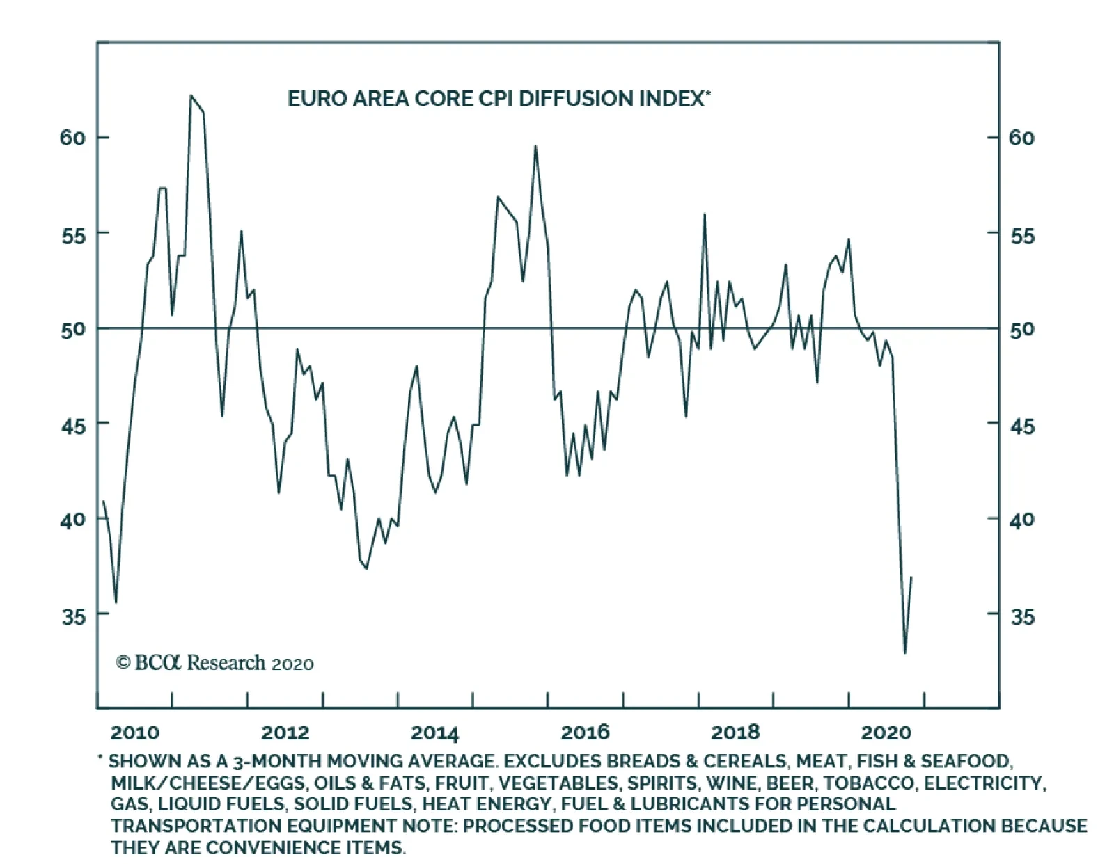 The chart above presents a diffusion index for euro area core inflation. The index is calculated based on the number of CPI subcomponents whose inflation rates are accelerating (i.e. a rising year-over-year growth rate), and includes a total of 75…