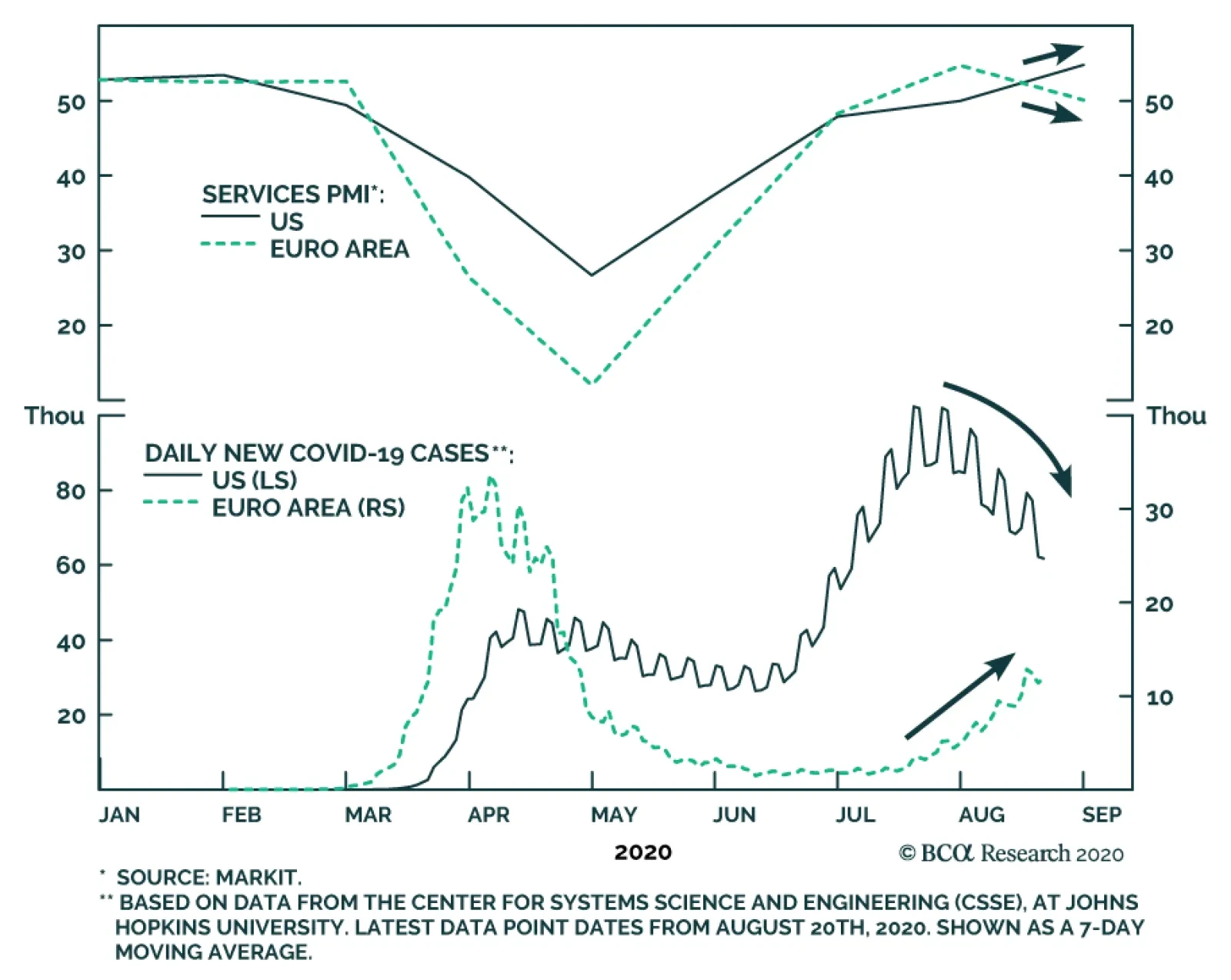 The second wave of COVID-19 infections in the US has been disasterous, but new cases seem to have peaked around July 16th. Meanwhile, the second wave of infections is currently gathering steam in Europe. This differentiation will have an economic impact. …