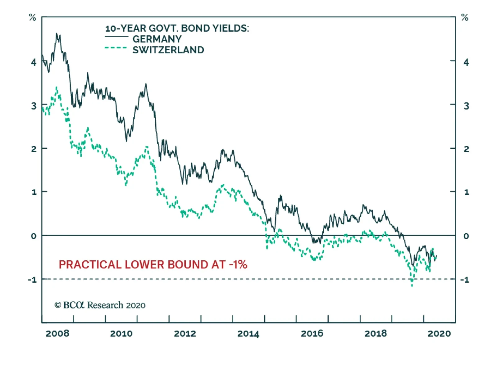 European investors have been left defenceless. German bunds and Swiss bonds used to be the safest of haven assets. You used to be able to bet your bottom dollar – or euro or Swiss franc for that matter – that the bond prices would rally during a demand shock. Not in 2020. When the global economy and stock markets collapsed from mid-February through mid-March, the DAX slumped by -39 percent. Yet the German 10-year bund price, rather than rallying, fell by -2 percent, while the Swiss 10-year bond price fell by -4 percent.1 The lower limit to bond yields is around -1 percent. The reason is that German and Swiss bond yields are close to the practical lower limit to yields, which we believe is around -1 percent (Chart I-2). This means that German and Swiss bond prices cannot rise much, though they can theoretically fall a lot. Chart I-2German And Swiss Bond Yields Are Near Their Practical Lower Bound