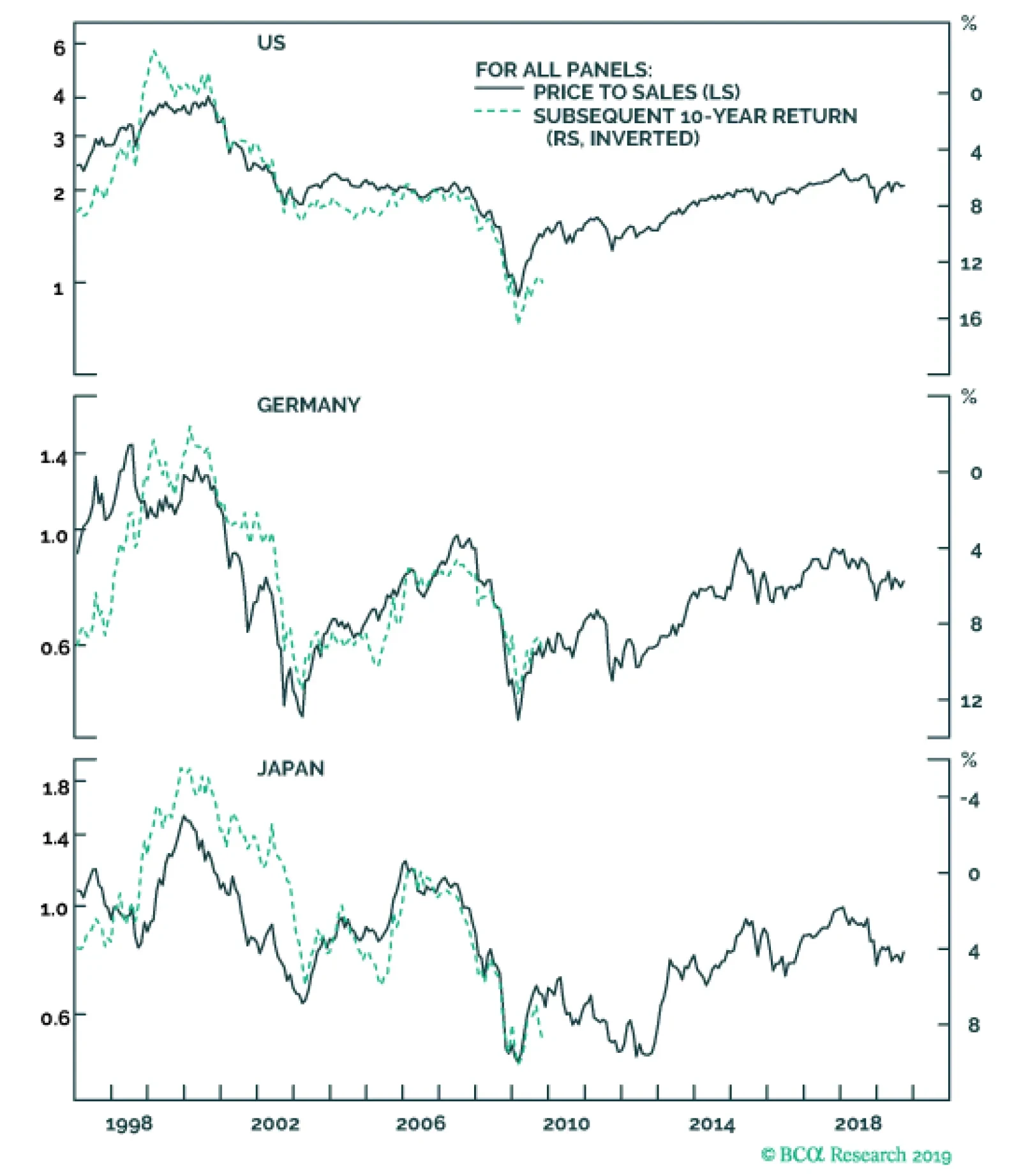 First, stock markets have very different sector compositions. Two sectors with vastly different structural growth prospects – say, technology and banks – must necessarily trade on vastly different valuations. So the sector with the lower valuation is not necessarily the better-valued sector. By extension, the stock market with the lower valuation because of its ‘sector fingerprint’ is not necessarily the better-valued stock market. Second, major stock markets are dominated by multinational companies with mixed currency sales and profits, while the stock price is quoted in the domestic currency. Hence, if the market expects the mixed currency profits to depreciate in domestic currency terms, the stock will trade at a discount. Put another way, if the domestic currency is cheap the stock market will appear cheap. The best way to see this is to look at the two valuations of dual-listed multinationals like the UK/US cruise operator Carnival. In London, the stock trades on a price to forward earnings at 9.7; in New York it trades at 10.3. But it would be absurd to suggest that Carnival is cheaper in London than in New York! The discrepancy is simply because the market expects the pound to appreciate versus the dollar. A head-to-head comparison of stock market valuations is misleading. Allowing for the distortions from sector skews and currency adjustments, the best way to assess an equity region’s attractiveness is to quantify the prospective return implied by its valuation versus its own history. The method is to regress historic starting price to sales with the (historic) prospective 10-year returns that followed. Then apply this relationship to the current price to sales to predict the (current) prospective 10-year return. The results are amazing. Despite the vastly different price to sales multiple of 0.9 in Germany and Japan, and 2.1 in the US, the implied prospective 10-year annualised returns are almost identical – at around 5 percent from each of the three stock markets (Chart I-8-Chart I-10). Chart I-8Expect Near-Identical Returns From The US...
