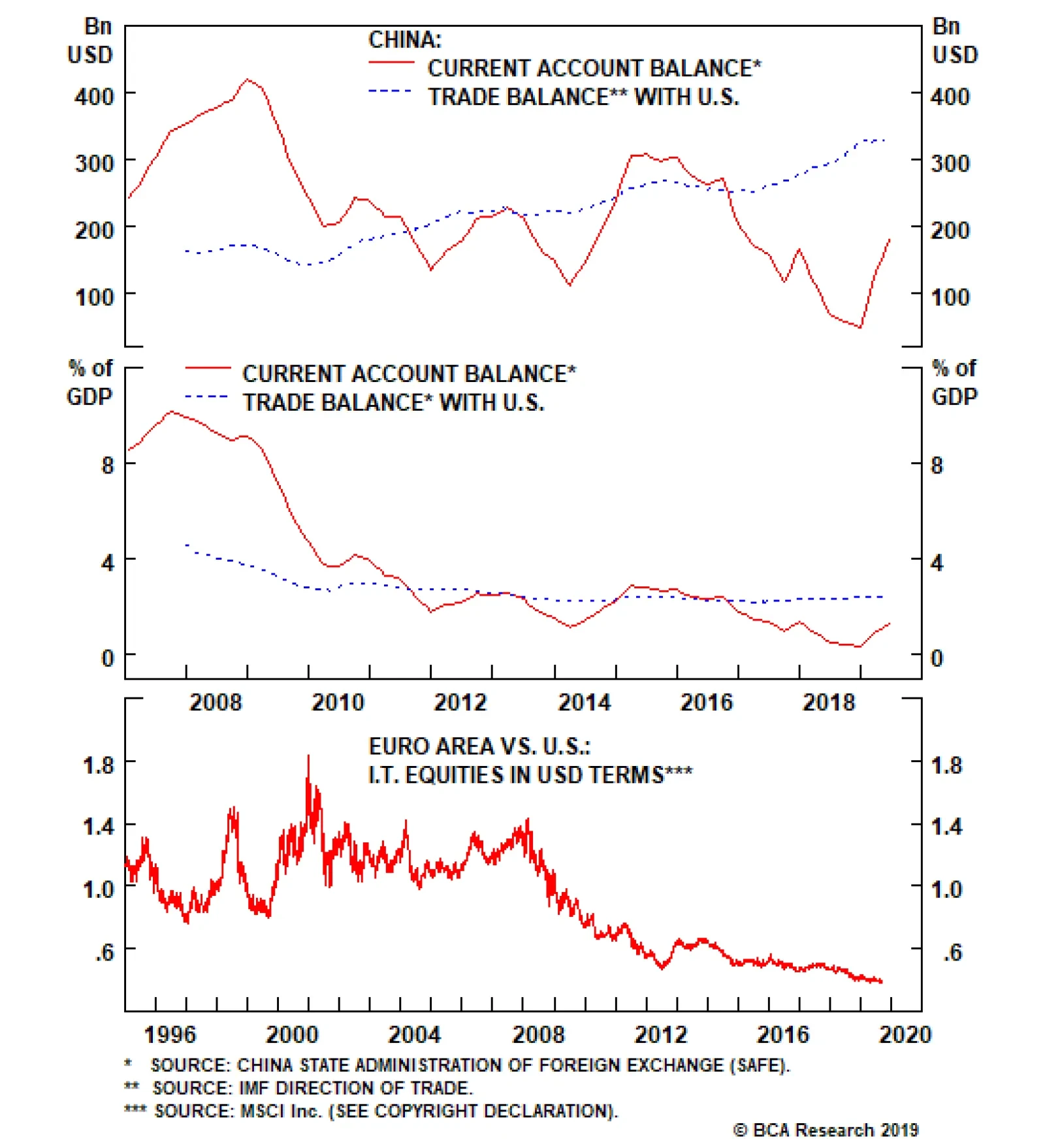 Bottom Line: A deterioration of the U.S.-China trade relationship would be a boon for European exporters. Short of a total breakdown of U.S.-China trade, however, European tech stocks may finally begin outperforming their U.S. counterparts thanks to the open distrust between U.S. and China.In addition, U.S. technology firms are likely going to face a slew of regulatory challenges over the next decade. While not necessarily negative, these challenges will nonetheless create new headwinds for the sector.10 We are therefore initiating a structural theme of being long European tech relative to U.S.Investment ImplicationsAre there any broader themes to be extracted from the combined geopolitical forecasts presented in this report? Europe will not collapse, and it may benefit from the souring of U.S.-China geopolitical and economic relations.Long euro is an obvious theme. As our colleague Dhaval Joshi has recently pointed out, the chasm between monetary policies of the Fed and the ECB has become a major geopolitical risk. This is because it has depressed the euro versus the dollar by at least 10 percent – based on the ECB’s own competitiveness indicators. The exchange rate distortion stemming from polarized monetary policies is the culprit for the euro area’s huge trade surplus with the United States (Chart 22).In the short term, EUR/USD may have reached its practical (and geopolitically acceptable) lows. Yes, the ECB is readying another round of monetary stimulus on September 12, but the fiscal policy counterpart is likely to be tepid and thus fail to (yet again) take advantage of historically depressed borrowing costs on the continent. The September 12 ECB meeting may therefore be a “sell the rumor, buy the news” event for EUR/USD. Chart 22Monetary Policy Accounts For Bilateral Surplus