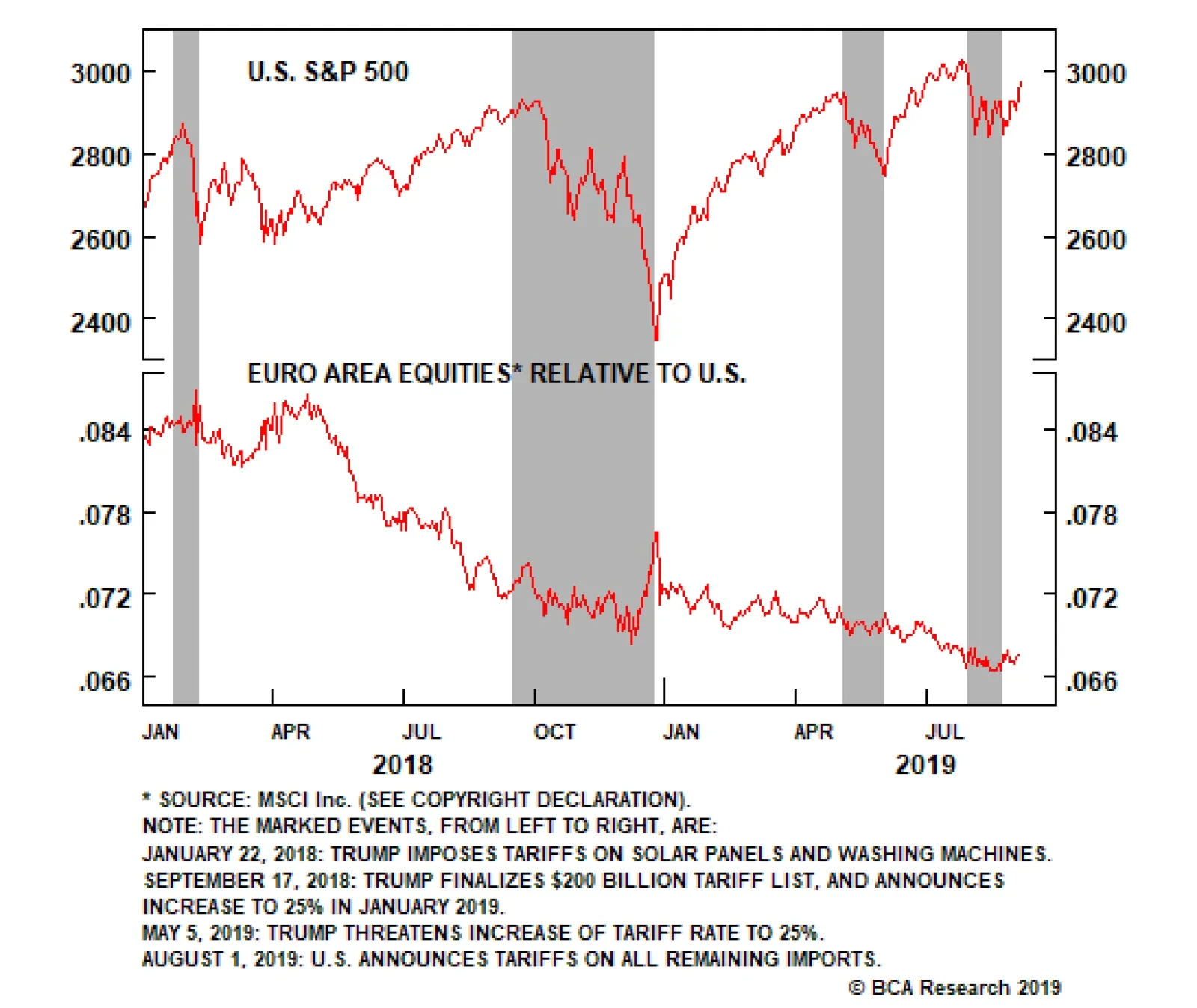 Bottom Line: There is an ever-strengthening case for the sustainability of the Euro Area and European integration well into the next decade.From Geopolitical Gambit To A Geopolitical Safe-Haven?At this point, we have built a strong case for why Europe will remain a high-beta play on global growth that is unlikely to collapse. As such, investors should plow into Europe when the rest of the world is doing well with confidence that the continent will not descend into chaos.The U.S.- China trade war offers an intriguing opportunity for Europe.This is largely underwhelming as an investment thesis. Could there be something more exciting to the story given a slew of well-known headwinds to European growth from demographics, low productivity, and regulatory malaise?The trade war between the U.S. and China does offer an intriguing opportunity for Europe.There appears to be an interesting development where European equities outperform those of the U.S. during periods of trade war turbulence (Chart 19). The outperformance is not major, but it is highly counterintuitive. Chart 19Europe Outperforms Amid Trade War Shocks