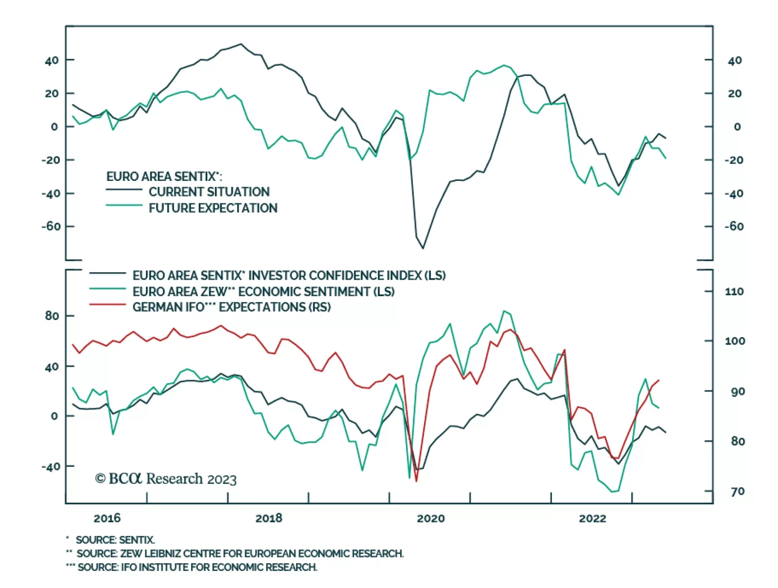 The lift to European investor sentiment from the ebbing energy crisis is now in the rear-view mirror. The German ZEW Indicator of Economic Sentiment fell back below 0 in May to -10.7 from 4.1. The negative reading indicates that…