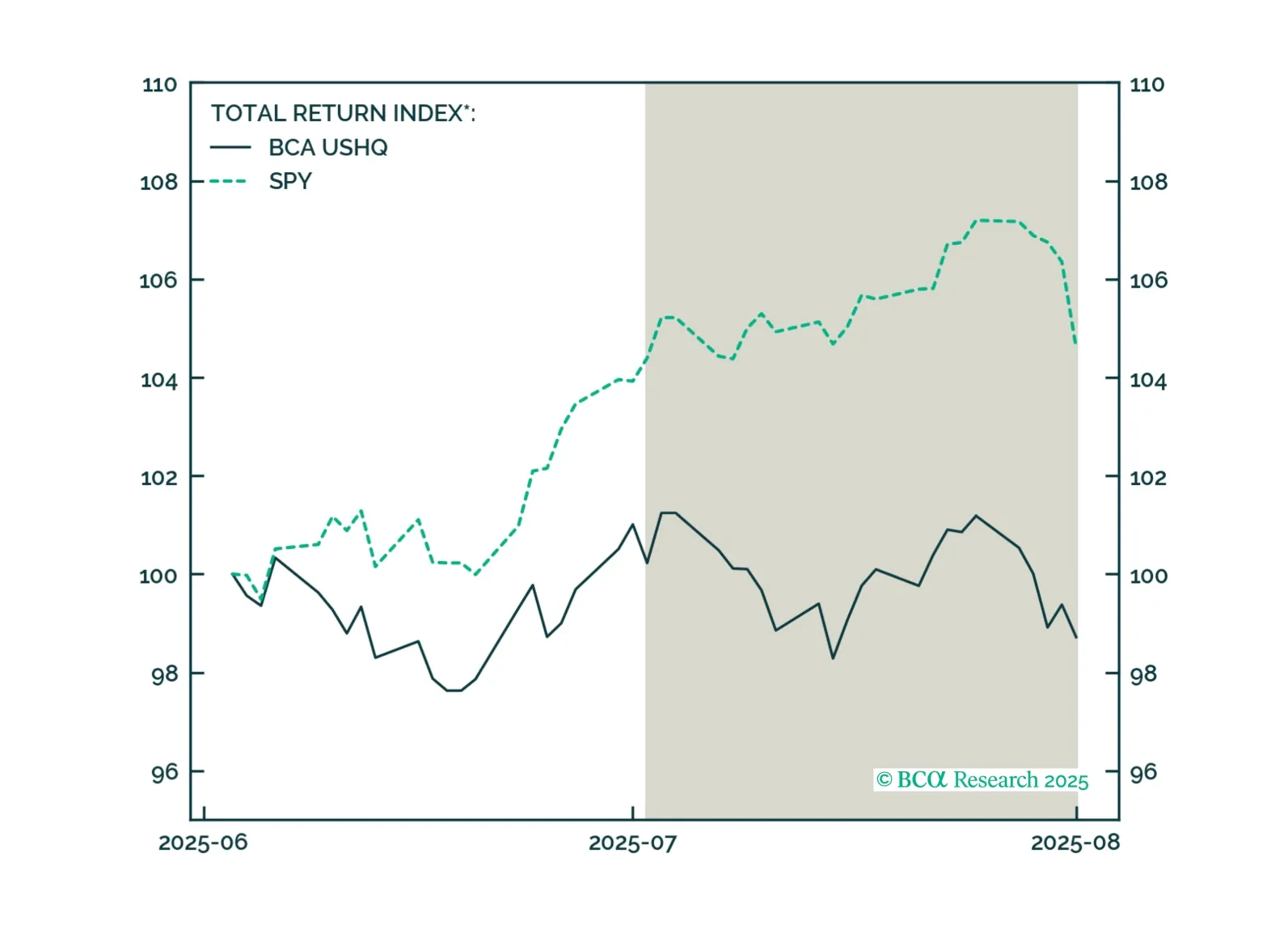 The US High Quality (USHQ) portfolio underperformed its benchmark through July, returning -1.5%, whilst its SPY benchmark returned 0.2%. On a trailing three-month basis, performance was notably weak vs. benchmark, with USHQ…