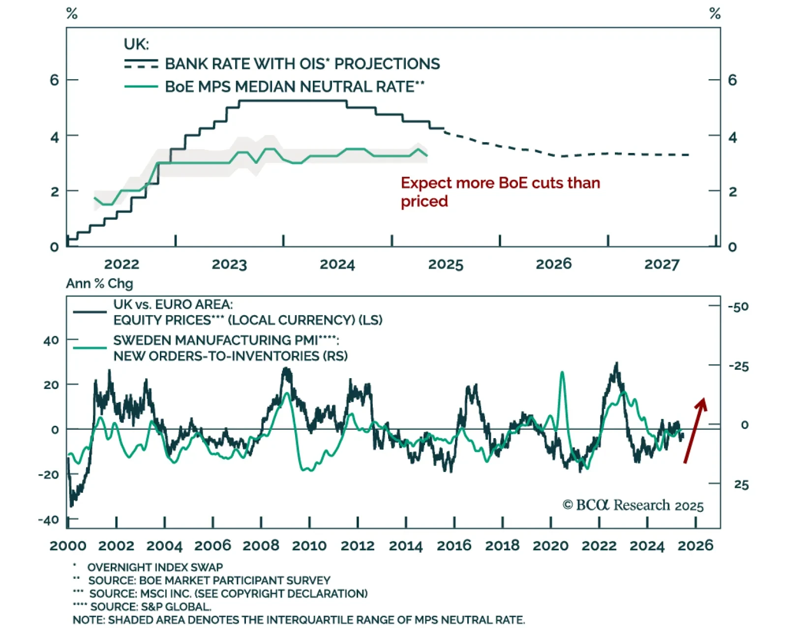 Our Global Fixed Income, FX, and European strategists expect aggressive BoE easing amid disinflation and labor market weakness, supporting an overweight in Gilts and UK equities versus the euro area. While UK productivity remains…