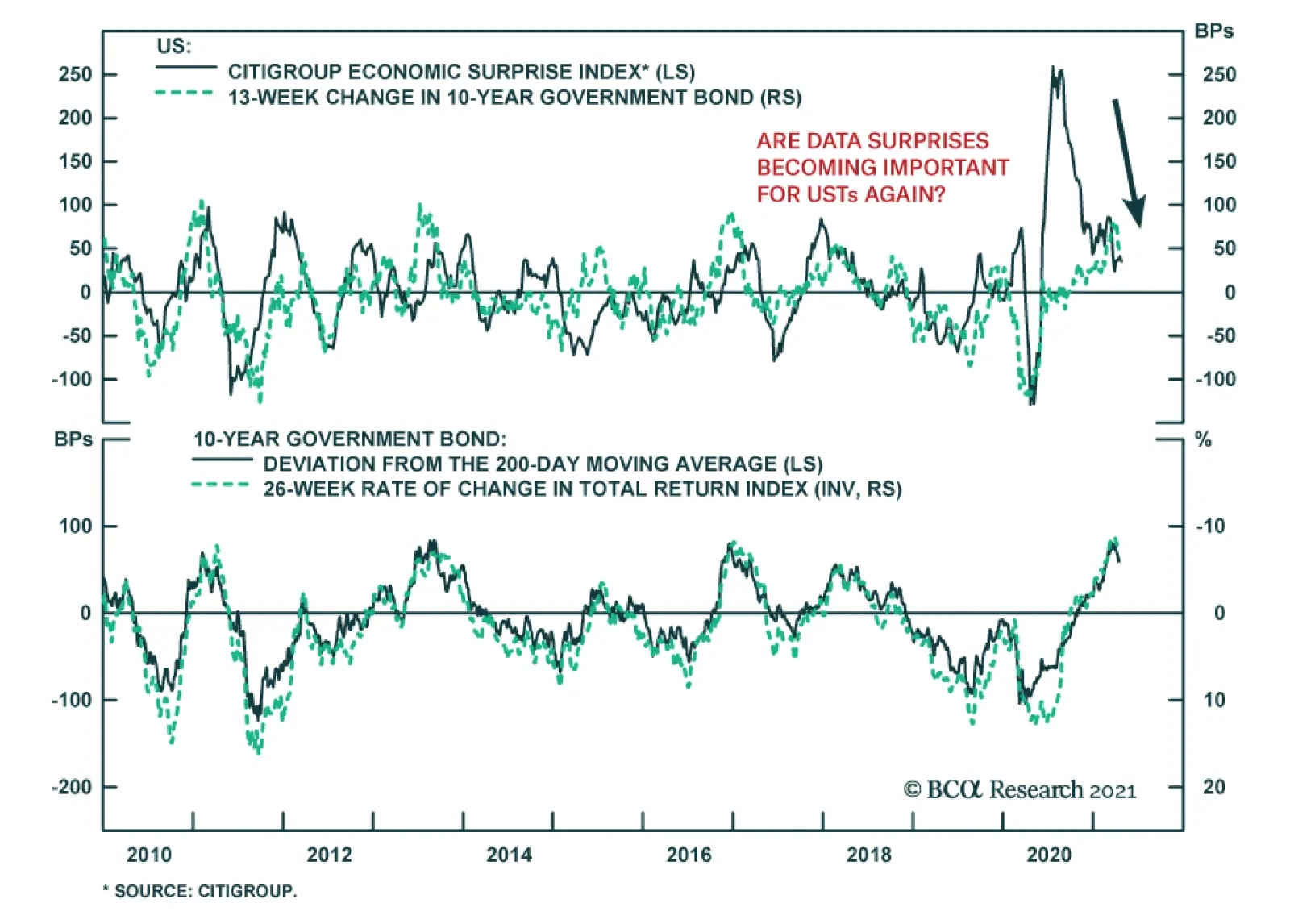 BCA Research’s Global Fixed Income Strategy service concludes that the cyclical rise in yields is not over yet. The overall flow of US economic data has been disappointing versus elevated expectations, as evidenced by…