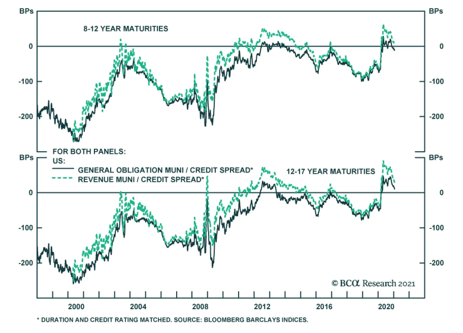 According to BCA Research’s US Bond Strategy service, muni value has deteriorated, but the sector still looks attractive compared to investment-grade corporate bonds. Municipal bond spreads have tightened dramatically…