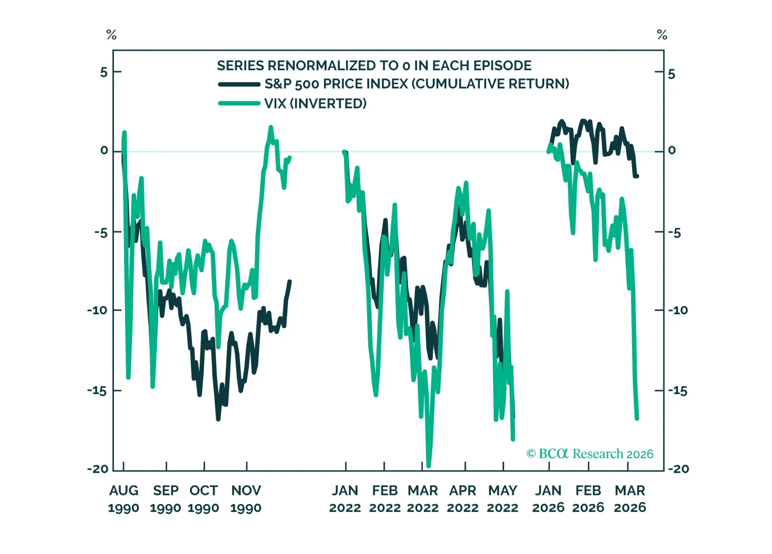 Middle East tensions sparked a surge in volatility, yet the S&P 500 decline has been comparatively modest. Across asset classes, moves seem related to risk preferences and near-term inflation concerns. Within equities, some cyclicals are under pressure, but the equity market’s growth view has been resilient, while the inflation view has climbed.