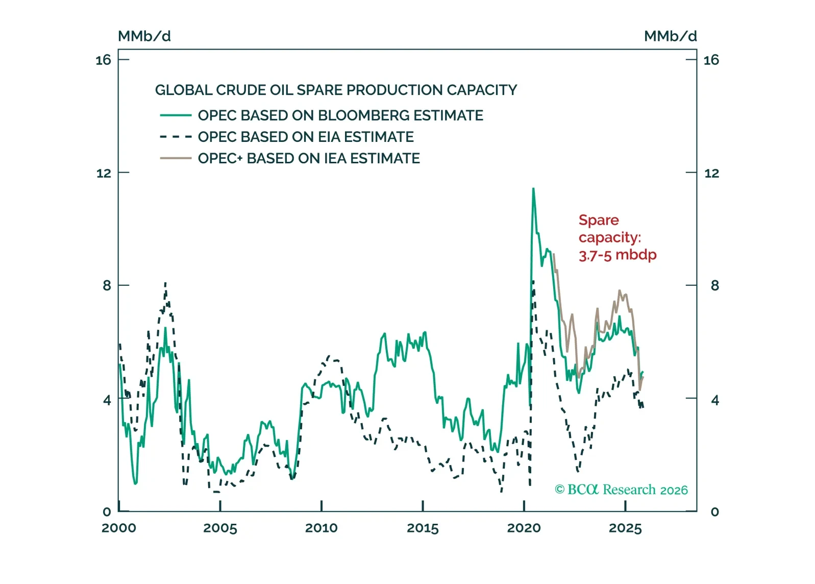 Our view has been borne out in the performance of industrial metals. Despite an absolute carnage of Chinese real estate demand, metals have held up (Chart 28). Undoubtedly our view has also been aided by the AI capex boom as well. To the litany of commodity bullish factors investors can now also add an “Age of Empires-like” scramble for commodities. To those of you who are unfamiliar with the popular computer game, The Age of Empires, the brief summary is that it is a strategy game built on hoarding of key resources. Players send their villagers out to cut the timber, mine for gold, and till the fields in order to win. President Trump’s unabashed intervention in Venezuela and repeated talk of annexing Greenland break all norms against hoarding of natural resources that may have existed since the end of the Cold War. The premise that all of the world’s commodities are freely traded on the open market – and thus need not be horded – has been upended. While the case of Venezuela is an obvious one, President Trump’s assertion that the US “needs” Greenland is far more jarring.28 Greenland is part of Denmark, a staunch US ally even above and beyond its fellow NATO member states. Whatever commodities are mined in Greenland are freely available for US industrial, tech, and defense use. That, apparently, is not enough for President Trump and his advisors. This is a major norm departure. One that we suspect will lead global powers – but also investors – to begin hoarding physical commodities, creating a geopolitical “Age of Empires Premium” above and beyond supply and demand dynamics. Such non-economic demand has already ensnared precious metals. We suspect that 2026 will see a violent rise in demand for industrial metals as well. At the moment, we are long copper, nickel, and palladium in this space, but may add more to our portfolio soon. The irony of President Trump’s intervention in Venezuela, therefore, is that it was partly motivated by a desire to increase America’s access to critical commodities. The reality, however, is that it has done precisely the opposite. We also disagree with the consensus that oil prices should fall given the opening up of new supply in Venezuela. The 2025 story of oil prices is almost exclusively one of increased OPEC+ supply. As we recently penned in our net assessment of Saudi Arabia, OPEC+ policy may have to be reversed due to Riyadh’s policy priorities and deteriorating fiscal picture.29 Meanwhile, Venezuela is highly unlikely to bring online any new oil barrels in 2026, nor in any conceivable future. As a result, we will initiate a long Brent position, with a tight stop-loss of 3%, with the expectation that Riyadh will eventually succumb to domestic pressures and reverse the max-production OPEC+ policy at some point in 2026. We are also buying energy equipment and services companies, a high-beta play on rising oil prices. To this, investors should also add a “Chuck Norris premium.” Named after the Hollywood macho demi-God of the 1980s, this premium ought to be applied to oil prices now that the US has shown a proclivity to special operations-induced regime change. The capture of Venezuelan President Maduro was a spectacular success. Policymakers rarely bottle up their successes on the shelf. They tend to want to repeat them. We fear that President Trump may decide to try his hand at more such regime change operations, with Iran potentially next in line. If this is the case, we would expect Iran to act much differently than it did in 2025. Last year, we cautioned our clients not to go long oil due to the Israeli and American attacks on Iran. Neither threatened the regime existentially. But an overt attempt to attack the leadership could elicit a much different response from Tehran. Bottom Line: The “Age of Empires Premium” calls for a significant long industrial metals position by global investors. The “Chuck Norris Premium” suggests that oil prices are reaching their bottom, as Saudi Arabia’s domestic politics but also geopolitical risks shift from bearish to bullish for oil prices. We take a dramatically different view on what the US intervention in Venezuela means for commodity prices. Not only is it not bearish for oil prices, it may be epically bullish for industrial metals. Marko PapicChief Strategist,GeoMacro & BCA Accessmarko@bcaresearch.com HousekeepingAs the front section of the Alpha report suggests, we are having to digest a lot of information as we enter 2026. Paradoxically, the constant influx of information is helping us build an “all weather” portfolio that has a strong bias to some of our core views.Let us review some of the core themes that underpinned our trades in 2025 and provide some guidance on how we see these evolving in 2026. Hard assets versus financial assets: This remains in place. Silver, platinum, palladium and gold were some of the best performing assets in 2025. This will continue in 2026, with some rotation into other hard assets that are truly scarce.The equity-bond correlation: The present value of cash flows will continue to rise – if bond yields in the US fall and remain below 4%. They are stubbornly above that level.US exceptionalism: We remain of the view that US exceptionalism is over, and recent events have certainly challenged that. That said, we posited not to fight The Trump. More on this below.EquitiesOur equity view is shifting, aligned with the checklist we are providing in the front section of this Alpha report. We are turning bearish on a three-month horizon. As such, we will start focusing more on trades that have asymmetric returns, rather than playing the directionality of markets. Our S&P target for the end of 2026 is still 7,500, but we have fat tails around that forecast. Twelve months is a long time, and we suspect that we may “round trip” towards that target over the course of the year.Starting with the new bets, buy energy servicing companies in t