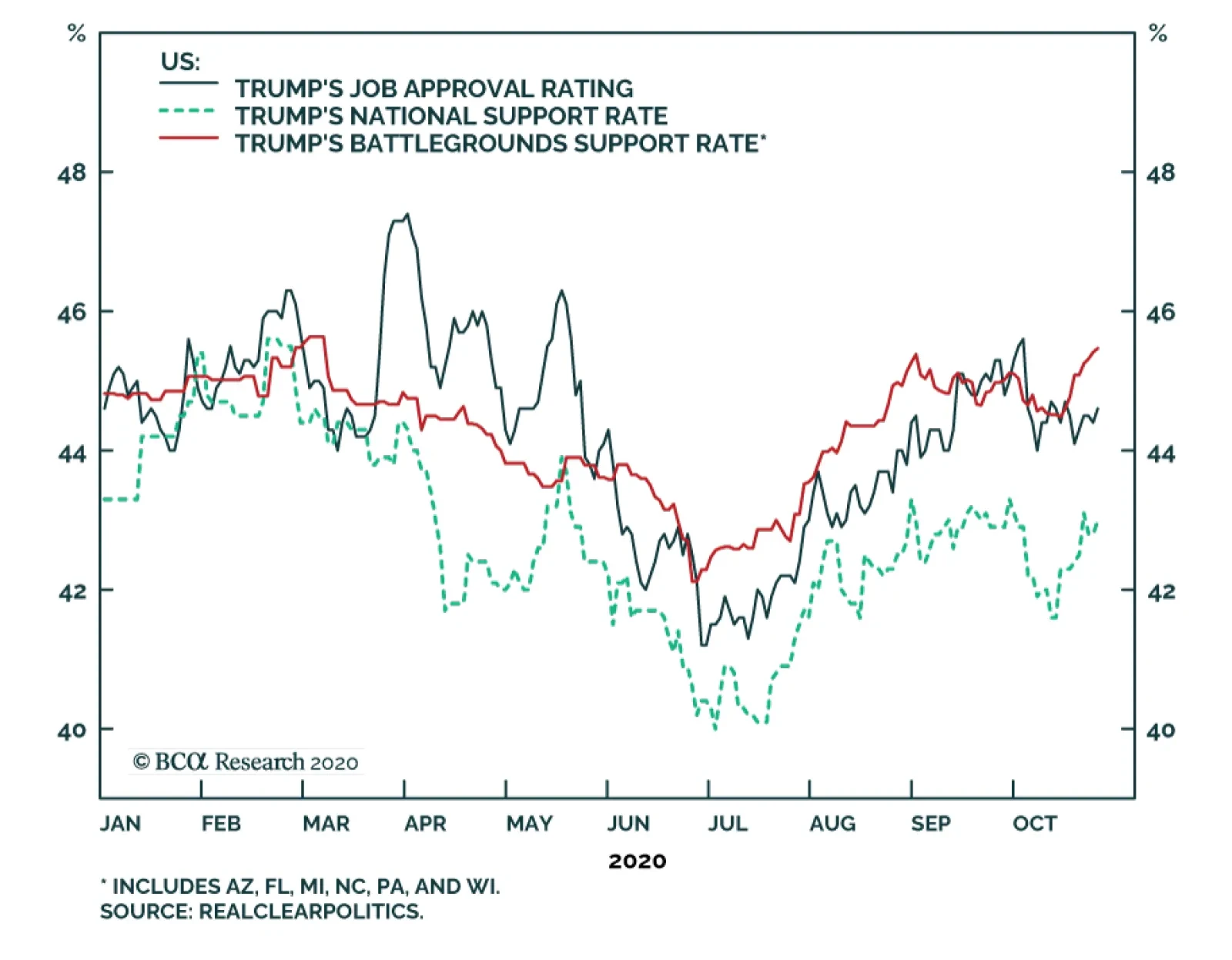 BCA Research's Geopolitical Strategy service is upgrading Trump’s odds of winning to 45%. BCA has bet on a Democratic sweep all year. Incumbent parties rarely survive recessions, and President Trump has mishandled the…